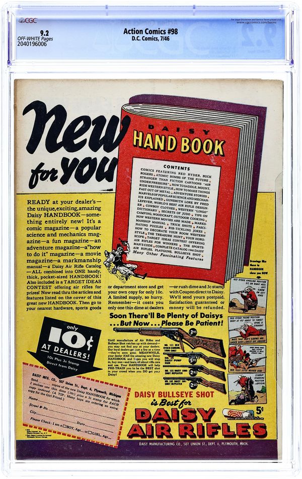Cover art by Win Mortimer. Happy Hobby Time! public service announcement starring Superboy, script by Jack Schiff, art by Win Mortimer. The Menace of Planet Z starring Superman, script by Bill Finger, pencils by Wayne Boring, inks by Stan Kaye. The Meteor Mystery starring Tommy Tomorrow, pencils by Curt Swan, inks by John Fischetti. Congo Bill's Last Fight, script by Jack Miller, art by Ed Smalle. Outlaws For Sale starring Vigilante, art by Bob Brown. 44 Pages, Full Color. $.10 Cited in Parade of Pleasure. Cover price $0.10.