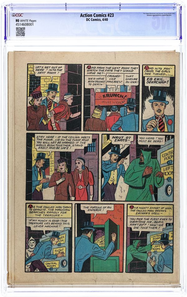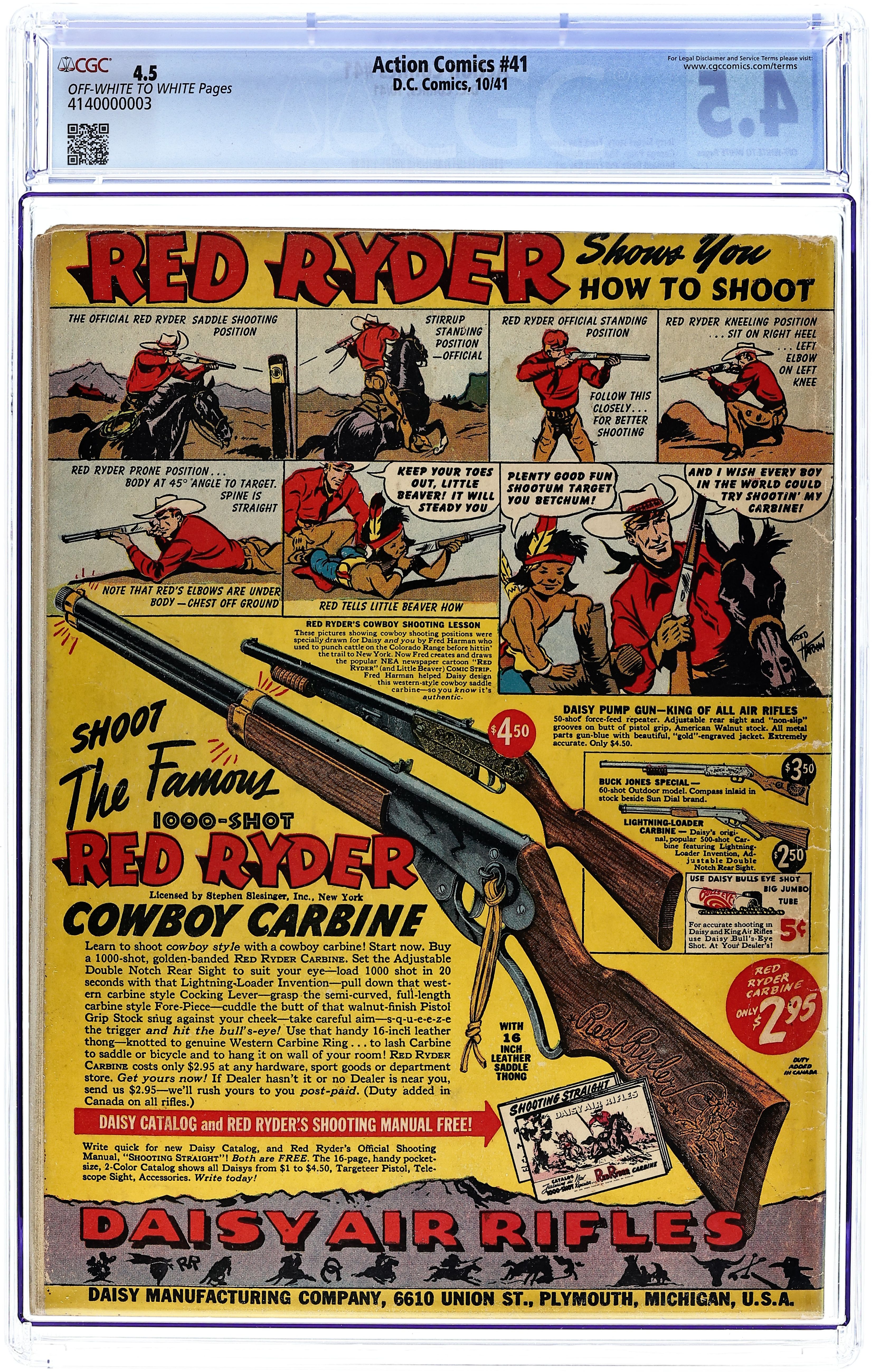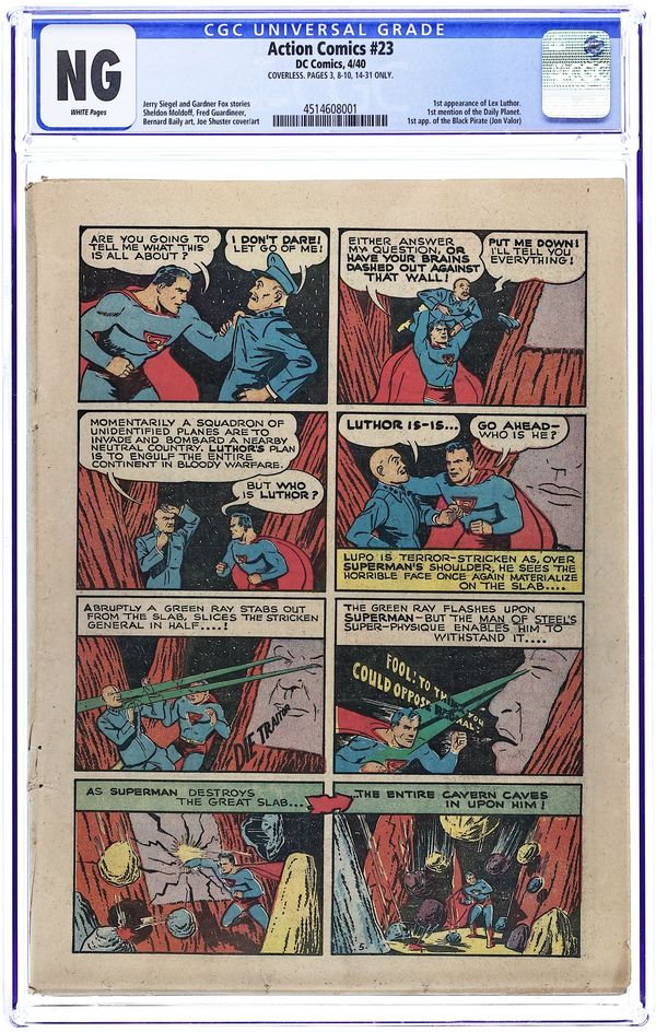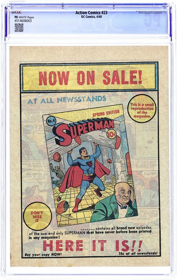 Cover art by Joe Shuster. Legendary issue featuring the origin and 1st app. of Superman by Jerry Siegel and Joe Shuster. 1st app. of Zatara and Lois Lane. One-page Superman story, script by Jerry Siegel, art by Joe Shuster; A space vehicle from a destroyed world lands on Earth, and its occupant becomes Superman; In addition, a scientific explanation for this being's powers is given. "The Coming of Superman," script by Jerry Siegel, art by Joe Shuster; Superman delivers a witness to the governor to stop an execution, then stops a wife-beater; Later Superman, as Clark Kent, goes out with Lois, but she earns the wrath of Butch Matson and Superman must save her; Finally, Clark is assigned a story on the South American republic of San Monte. Superman ad. "The A-G Gang," art by Homer Fleming; Chuck begins a vendetta against the crooked ranch owners who have, by fraud, acquired the range lands he inherited after his father's death. "The Mystery of the Freight Train Robberies," script and art by Fred Guardineer; Zatara and Tong investigate the murders of several railroad detectives and the theft of over $200,000 in loot. "South Sea Strategy" text story by Captain Frank Thomas. "Sticky-Mitt Stimson," script and art by Russell Cole (as Alger); Sticky swipes some apples and is pursued by the police. He gets a lucky break to make good his escape. Untitled The Adventures of Marco Polo story, art by Sven Elven; Marco, his father and his uncle are given an audience with the new Pope; They are sent on a mission to satisfy a request from the Khan of Tartary for priests and men of learning. "The Light Heavyweight Championship," script by Gardner Fox, art by Fred Guardineer; When the Boxing Commission runs a dirty fight trainer out of town, he swears his revenge...against Pep. "The International Jewel Thief," art by Will Ely; An international jewel thief arrives in America as a prisoner, but Scoop and Rusty are on hand to witness his escape with the help of his gang lying in wait. "Murder in England," art by Bernard Baily; Ken is framed for the murder of a man, and, with the help of Betty and Bobby, sets out to prove his innocence. Stardust cartoon. Odds 'n Ends cartoon by Sheldon Moldoff on inside back cover. 68 Pages, Full Color. $.10 Cover price $0.10.