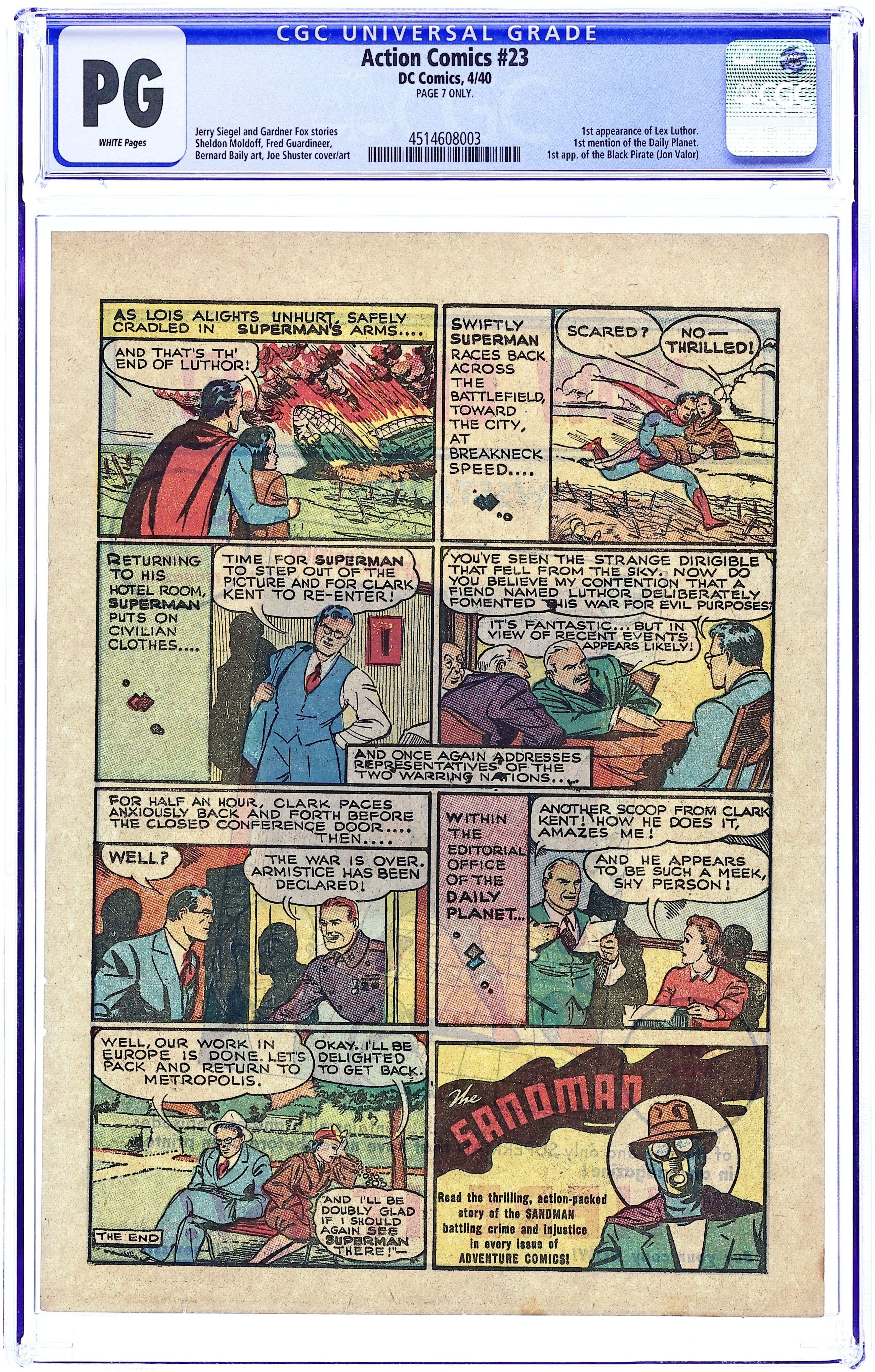 Cover art by Joe Shuster and Paul Cassidy. Superman story, script by Jerry Siegel, art by Joe Shuster. Pep Morgan story, art by Fred Guardineer (as Gene Baxter). Black Pirate story, art by Sheldon Moldoff. Three Aces story, script by Gardner F. Fox, art by Chad Grothkopf. Tex Thomson story, art by Bernard Baily. Clip Carson story, art by Sheldon Moldoff. The Treasure Tower starring Zatara, script by Gardner F. Fox, art by Fred Guardineer. 68 Pages, Full Color. $.10 1st app of Lex Luthor (with red hair), 1st app of Black Pirate, 1st mention of Daily Planet instead of Daily Star, 1 panel ad for The Spectre in More Fun. Cover price $0.10.