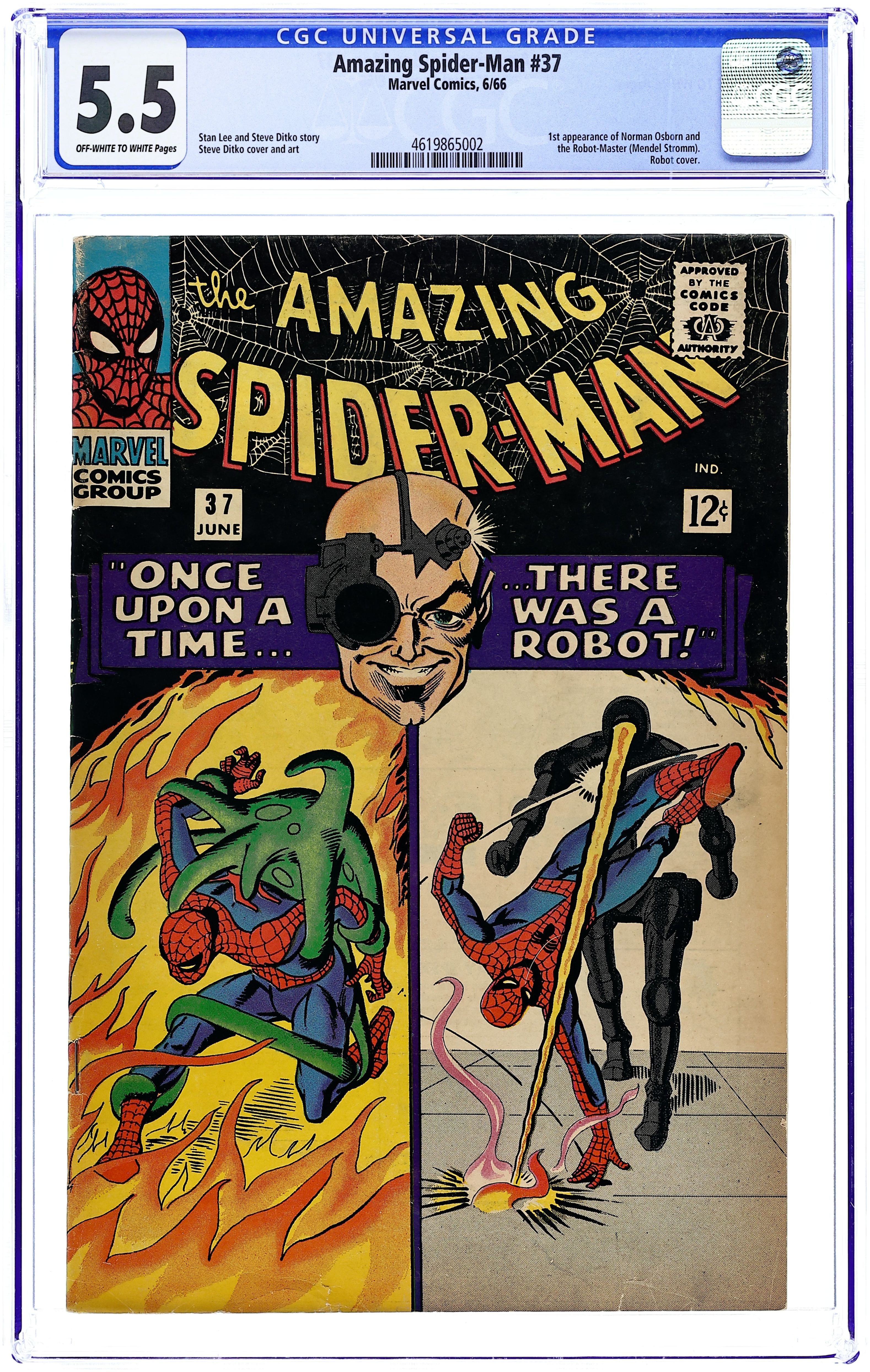 Cover by Steve Ditko. First appearance of Norman Osborn (the original Green Goblin) in Once Upon A Time, There Was A Robot...!, script by Steve Ditko (plot) and Stan Lee (script), art by Steve Ditko; When Professor Stromm is released from prison he plans to take revenge on his old business partner, Norman Osborn. Reprinted in Marvel Tales # 176. 36 pgs., full color. $0.12. Cover price $0.12.