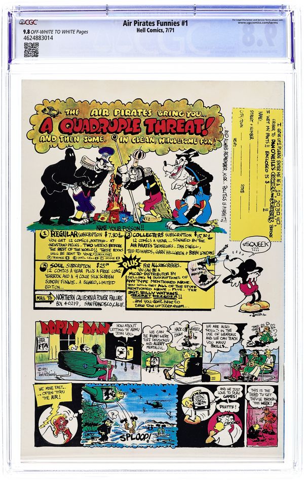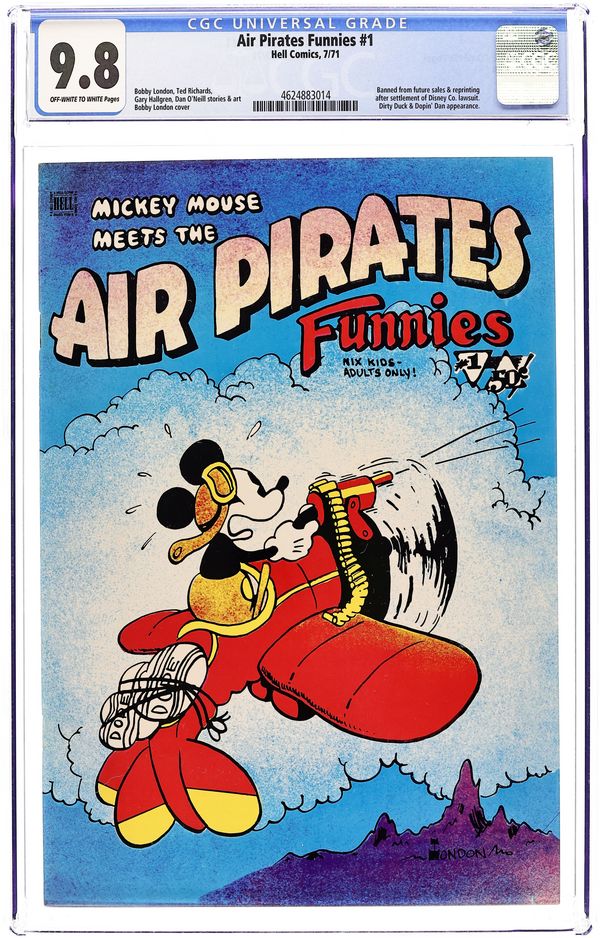Controversial parody discontinued due to Disney lawsuit. The Air Pirates were a group of cartoonists who created two issues of an underground comic called Air Pirates Funnies in 1971, leading to a famous lawsuit by The Walt Disney Company. Founded by Dan O'Neill, the group also included Shary Flenniken, Bobby London, Gary Hallgren, and Ted Richards. The collective shared a common interest in the styles of past masters of the comic strip: Flenniken emulated George McManus's Bringing Up Father in her Trots and Bonnie comics, London's strip Dirty Duck paid homage to the styles of E.C. Segar's Thimble Theater and George Herriman's Krazy Kat, and Richards' Dopin' Dan was similar to Mort Walker's Beetle Bailey. The original Air Pirates were a gang of Mickey Mouse antagonists of the 1930s; O'Neill regarded Mickey Mouse as a symbol of conformist hypocrisy in American culture, and therefore a ripe target for satire. The first issue of Air Pirates Funnies was dated July 1971, and the second issue dated August. Both were published under the Hell Comics imprint, and were distributed through Ron Turner's Last Gasp publishing company. The lead stories in both issues, created by O'Neill and Hallgren, focused on Walt Disney characters, most notably from Floyd Gottfredson's Mickey Mouse newspaper strip, with the Disney characters engaging in adult behaviors such as sex and drug consumption. O'Neill insisted it would dilute the parody to change the names of the characters, so his adventurous mouse character was called "Mickey" Cover price $0.50.