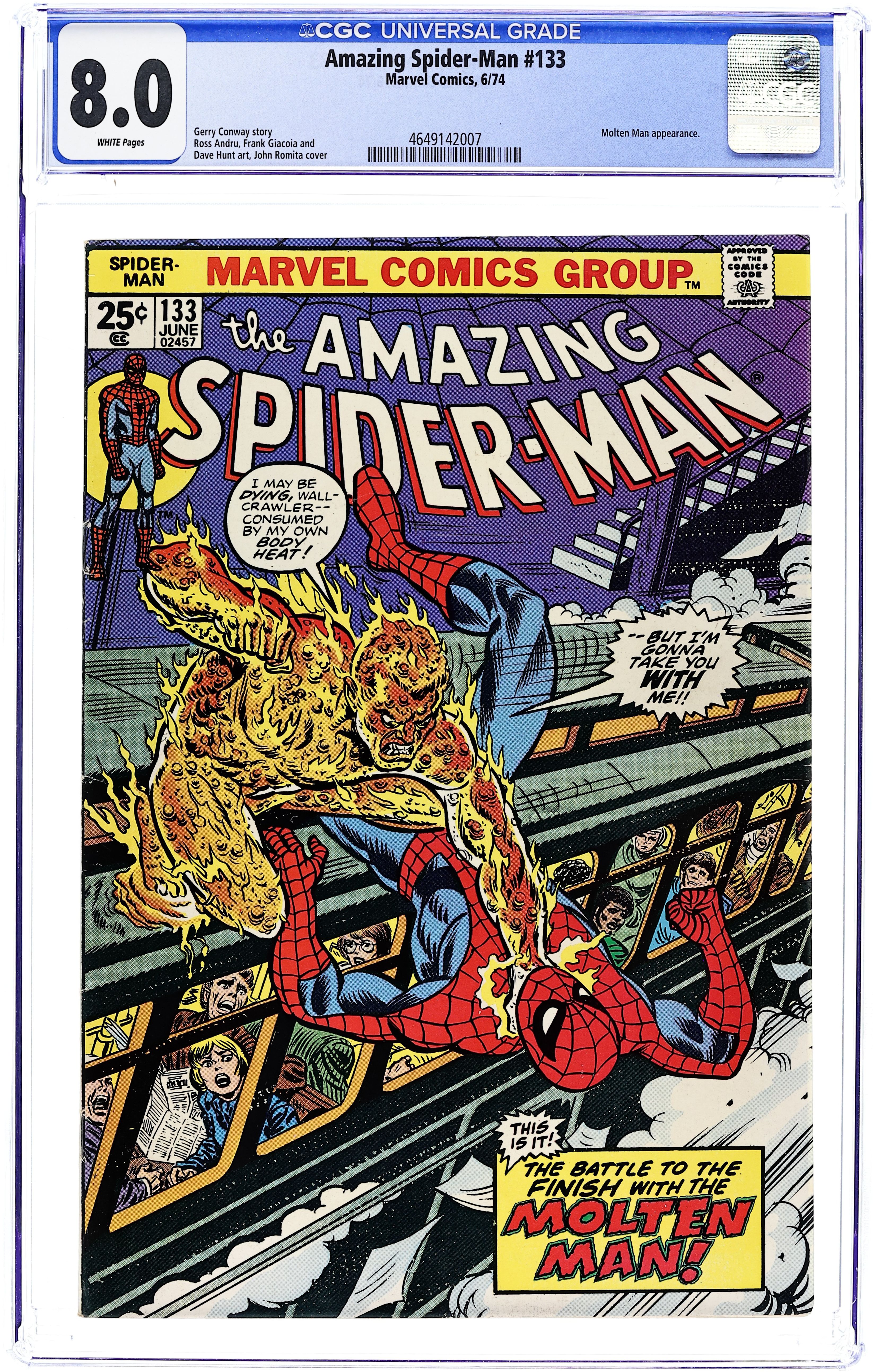 "The Molten Man Breaks Out!" Part 2 of 2. Script by Gerry Conway. Pencils by Ross Andru. Inks by Frank Giacoia and Dave Hunt. Cover by Gil Kane and John Romita. The Molten Man is completely out of control -- as he desperately gathers the minerals and isotopes needed to reverse his deteriorating condition. The web-slinger battles Mark Raxton's alter ego first in the hospital (to save Ned Leeds' life), then in the science museum, and finally on a subway train bound for Brooklyn! It's a fiery finish! But for whom? The Molten Man or your friendly neighborhood Spider-Man? Cameo appearances by Mary Jane Watson, Liz Allan, and J. Jonah Jameson. (Notes: The Molten Man returns in Amazing Spider-Man 172. Giant-Size Super-Heroes #1 featuring Spider-Man was also published this month. The letters page includes Marvel Value Stamp series A #66 General Ross by Herb Trimpe and Jack Abel. This issue was reprinted in Marvel Tales 110.) 32 pages. Cover price $0.25.
