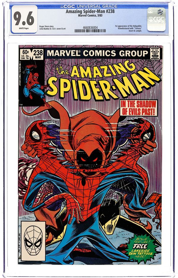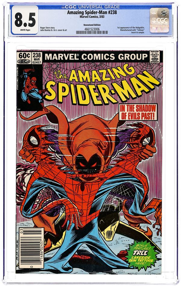 IMPORTANT: Issue 238A HAS the Lakeside Skin Tattooz insert. Newsstand Edition. First appearance of the Hobgoblin in "Shadow of Evils Past!" Script by Roger Stern. Art by John Romita Jr. (breakdowns) and John Romita Sr. (finishes). Cover by John Romita Jr. and John Romita Sr. One of the landmark issues of the Amazing Spider-Man! And the beginning of the long secret identity mystery of the Hobgoblin! After escaping from the web-slinger, a bank robber stumbles upon an underground hideout of the (deceased) Green Goblin! Not knowing what to do with his discovery, the small-time hood shows the secret lair to an underworld associate! Unfortunately for the wondrous wall-crawler, the devious associate knows exactly what to do: resurrect the Green Goblin...with a twist! And a short time later a new super-villain is born! The Hobgoblin! Cameo appearance by Mary Jane Watson. Flashback cameo by Norman Osborn (aka the Green Goblin). (Notes: The secret identity of the original Hobgoblin takes many twists and turns over the next decade. Who actually operates as the Hobgoblin in this issue is revealed in the Spider-Man: Hobgoblin Lives (1997) Limited Series (written by Roger Stern). This issue was reprinted in Marvel Tales 257 and also in the 1992 trade paperback: the Amazing Spider-Man -- Origin of the Hobgoblin.) 36 pages. Cover price $0.60.