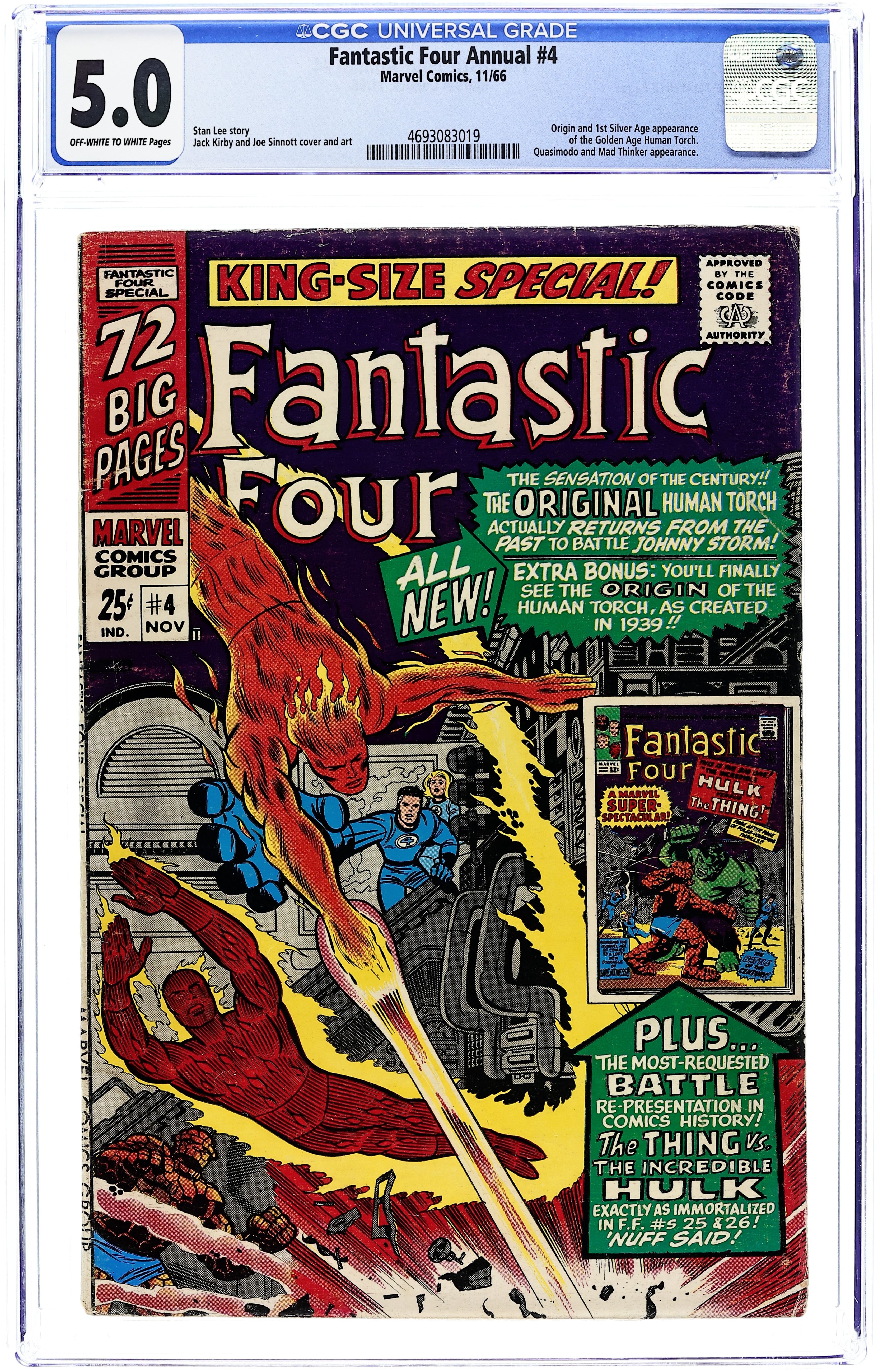 Starts Apr 27 The Golden Age Human Torch guest stars (his first Silver Age appearance) in a new story, "The Torch That Was!" Script by Stan Lee, pencils by Jack Kirby, inks by Joe Sinnott. This issue also reprints the first clash between The Hulk and Thing from Fantastic Four numbers 25 and 26 ("The Hulk vs. the Thing" and "The Avengers Take Over"). Kirby/Sinnott cover. 76 pgs. Cover price $0.25.