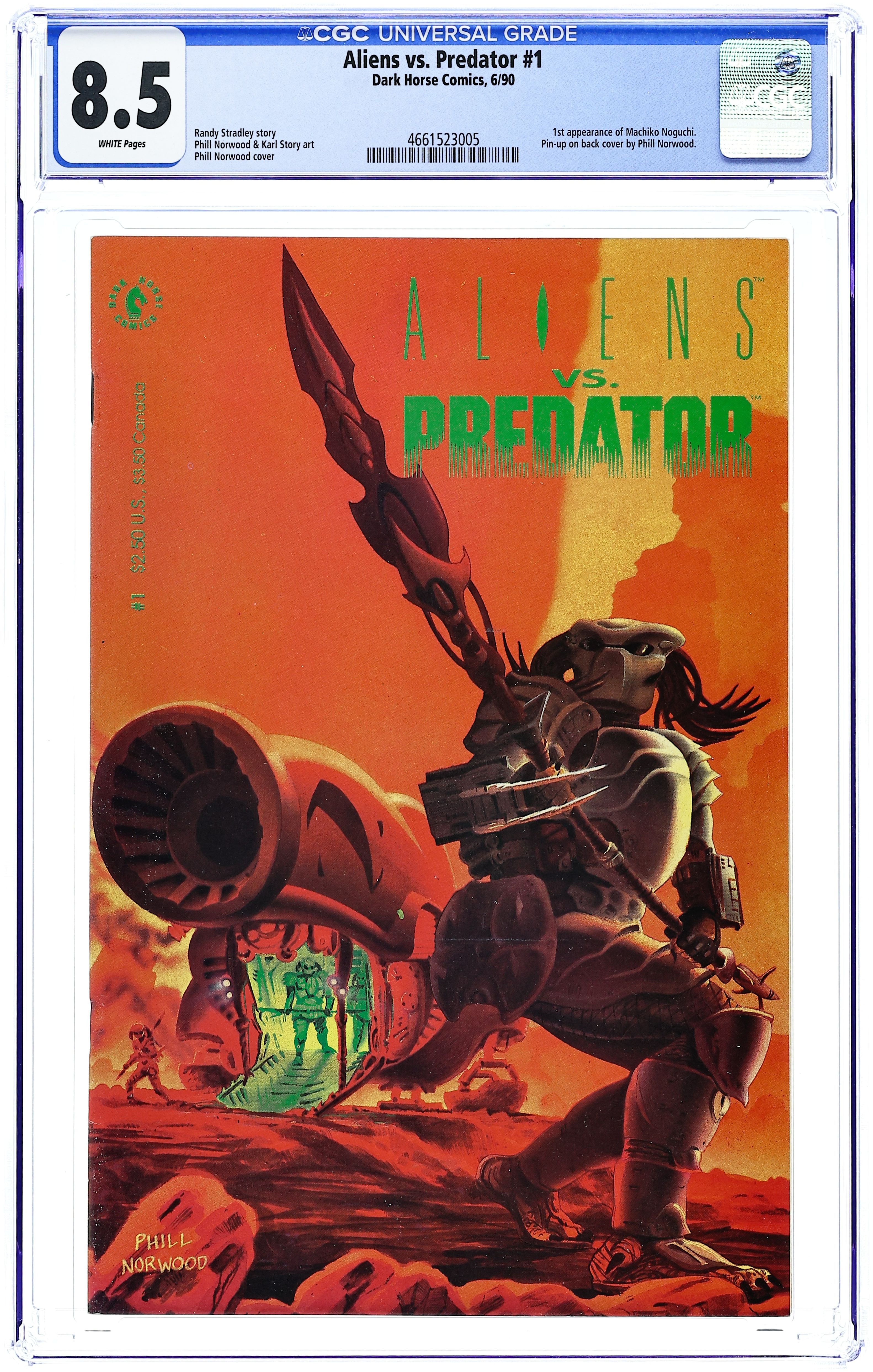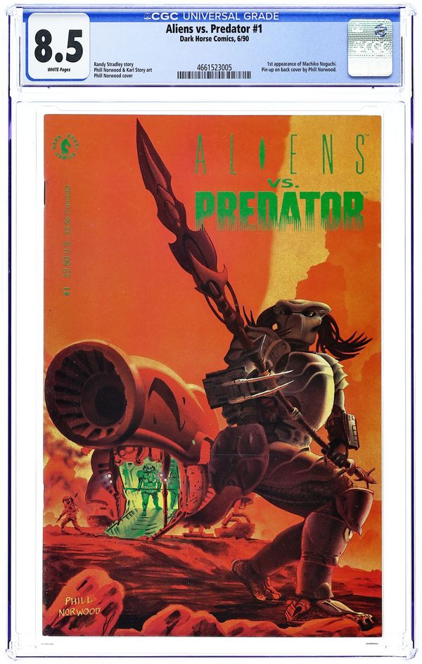 Written by Randy Stradley. Art by Phill Norwood and Karl Story. Cover by Phill Norwood. All hell breaks loose as the warring Predators begin their attack on the Alien brood- with the planet's inhabitants caught right in the middle! Machiko has a plan to roust all the invaders, but what can she do alone, with only a gun at her side? 32 pages, FC. Cover price $2.50.