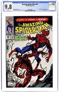 First Printing. Direct Edition. First (full) appearance of Carnage in "Savage Genesis!" Part 1 of 3. Script by David Michelinie. Pencils by Mark Bagley. Inks by Randy Emberlin. Cover by Mark Bagley and Randy Emberlin. Blood runs in the streets as a serial killer roams New York City! And as the web-slinger investigates the murders, he notices a very disturbing similarity to another killer's modus operandi! In a burned-out building in Brooklyn, the spectacular one comes face-to-face with his new homicidal foe...Carnage! Can the wall-crawler end Cletus Kasady's rampage in their very first encounter? Cameo appearances by Aunt May and Mary Jane Watson. Flashback cameo by Venom. (Note: This three-part story was reprinted in 2011 in the trade paperback: Spider-Man -- The Vengeance of Venom.) 36 pages, full color. $1.25 cover price. NOTE: Most of these were distributed with slight printer tears in the bottom edge of the cover. Cover price $1.25.