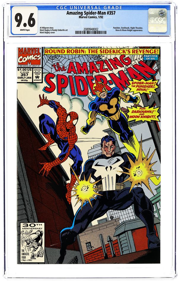 Cover pencils by Mark Bagley, inks by P. Craig Russell. The Punisher, Moon Knight, Nova, Night Thrasher, and Darkhawk guest star in Round Robin: The Sidekick's Revenge part 5, "A Bagel with Nova!", script by Al Milgrom, layouts by Mark Bagley, finishes by Randy Emberlin; Midnight and the Secret Empire members arrive at their Queens location; The disguised and still-weakened Punisher tries to get a message to Spidey but passes out; The heroes, tired and testy, decide to call it a night. Punisher revives and. as Number 3. frees Nova, who totals the transmission jammer and broadcasts a signal; Punisher then convinces his fellow Empire members to attack Midnight, who quickly defeats them; His cover blown; Punisher flees even as the heroes converge on Nova's signal. Spotting the Moon Copter, Darkhawk follows; The heroes battle Midnight and the Empire's troops joined by Dr. Franklin as a new technology-derived Thunderball who knocks out the arriving Darkhawk. 36 pgs., full color. $1.00. Cover price $1.00.