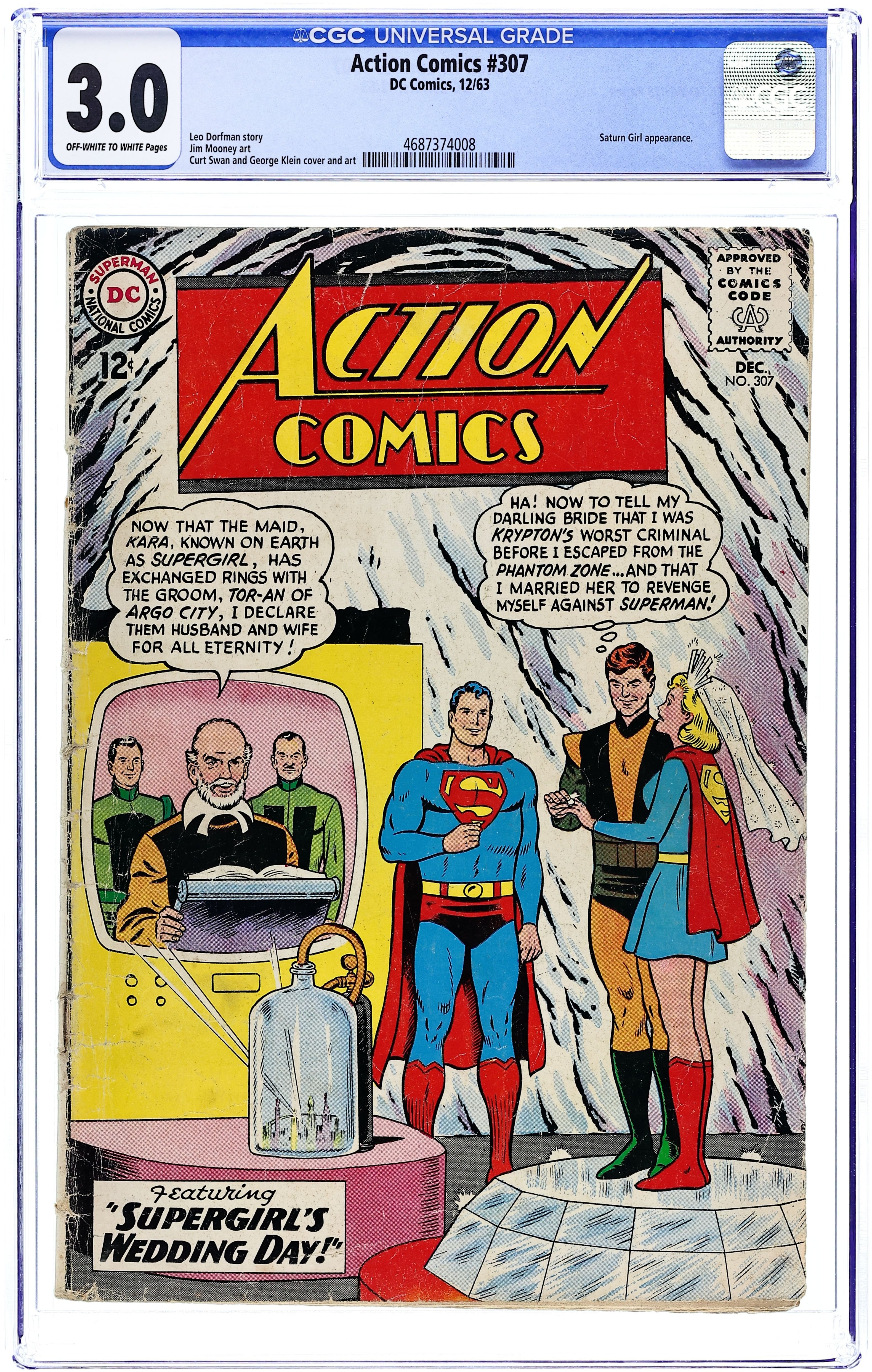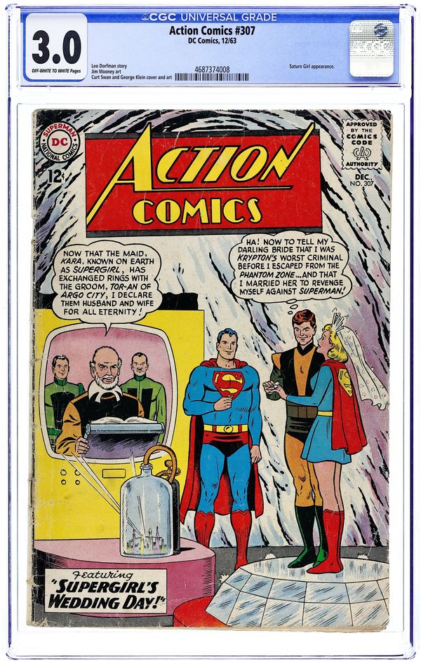 Cover pencils by Curt Swan, inks by George Klein. "Clark Kent - Target for Murder!", pencils by Curt Swan, inks by George Klein; Clark Kent writes a series of articles that anger crime boss King Kobra, so he hires assassins to murder Clark. The Untold Stories of Superman ad. Batman and Robin's Most Thrilling Mystery Cases ad. "Supergirl's Wedding Day!", script by Leo Dorfman, art by Jim Mooney; The Kryptonian criminal Tor-An escapes from the Phantom Zone and attempts to humiliate Superman's family by marrying Supergirl but is foiled when Supergirl's telepathic friends enlist the aid of Saturn Girl. Supermen of America ad. Action Comics ad. 36 Pages, Full Color. $0.12 Cover price $0.12.