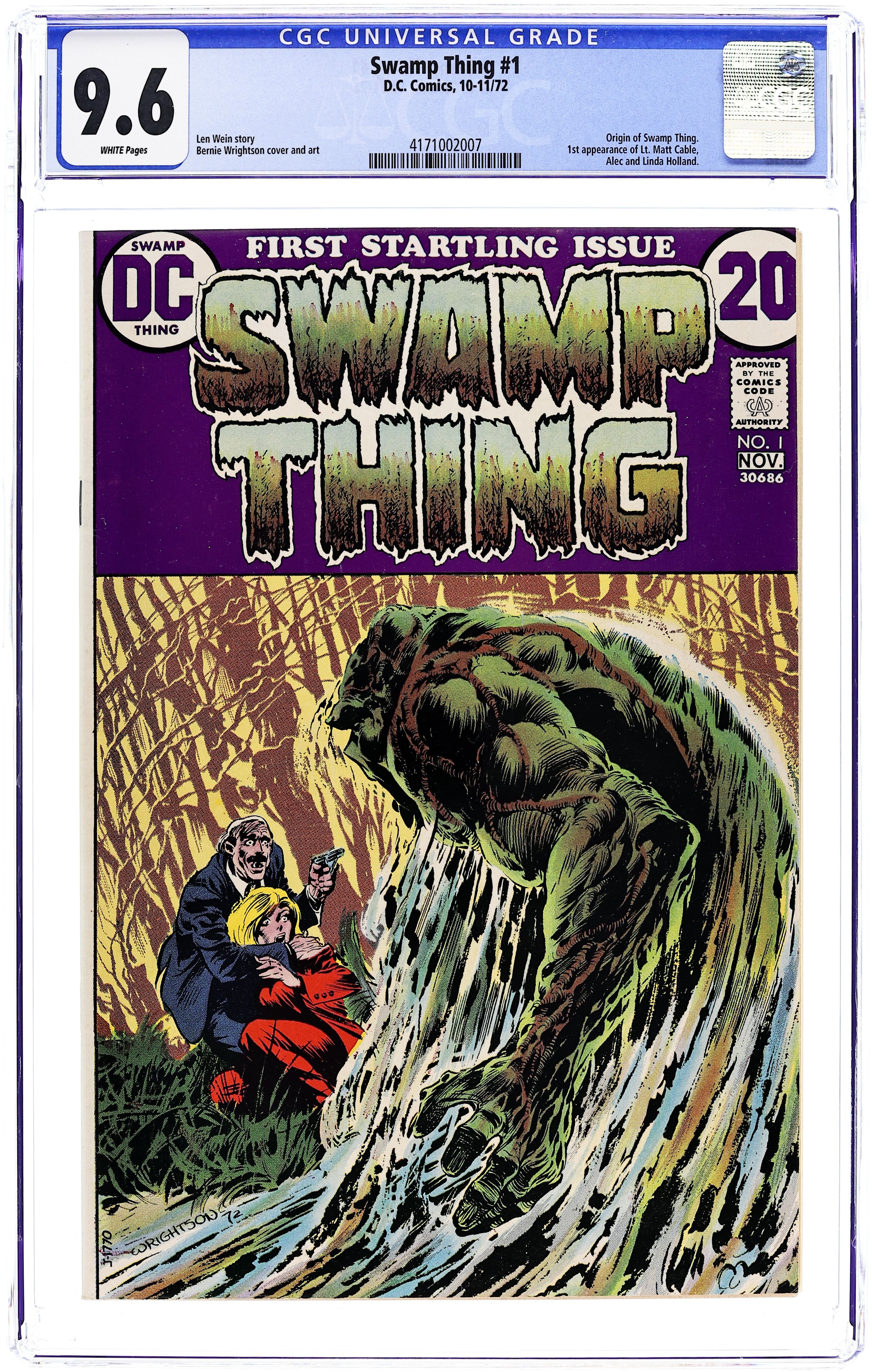"Night of the Bat." Swamp Thing goes to Gotham City and encounters Batman. Both are after Mr. E, who is leader of the Conclave. Script by Len Wein, art and cover by Berni Wrightson. Cover price $0.20.