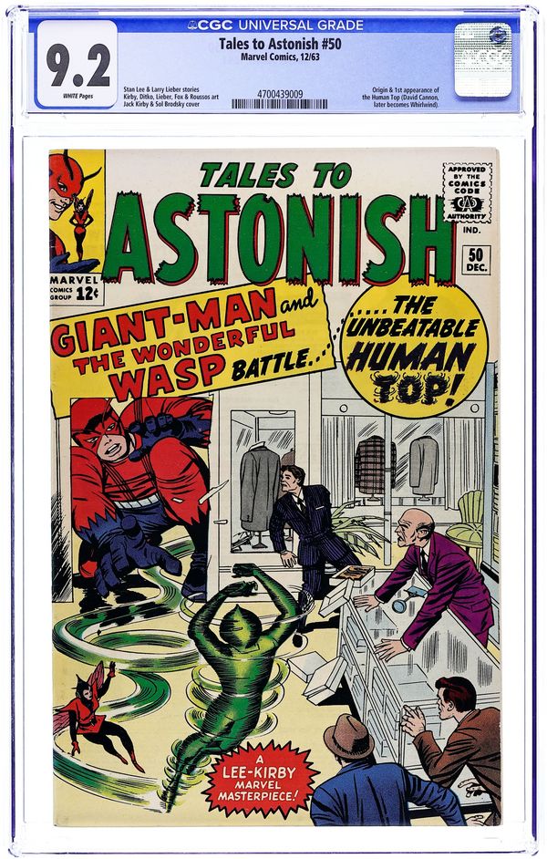 Cover by Jack Kirby and George Roussos. Showdown With the Human Top!, script by Stan Lee, art by Jack Kirby and Dick Ayers; Human Top steals civil defense plans and wants to sell them to the Communists. The Sorcerer text story, art by Joe Maneely; A man who has travelled the world and seen wonders performed by hermits in India returns home to find that his young nephew creates magic with only belief. No Place to Turn!, script by Stan Lee and Larry Lieber, art by Larry Lieber and Matt Fox; Aliens transform a spy into a human, but because they can only receive black-and-white images from Earth they leave him green and he is discovered. Somewhere Waits a Wobbow!, script by Stan Lee and Larry Lieber, art by Larry Lieber and George Roussos [as G. Bell]; The Wasp tells the tale of future mercenary pilot Rack Morgan who disobeys the rules once too many. 36 pgs., full color. $0.12. Cover price $0.12.