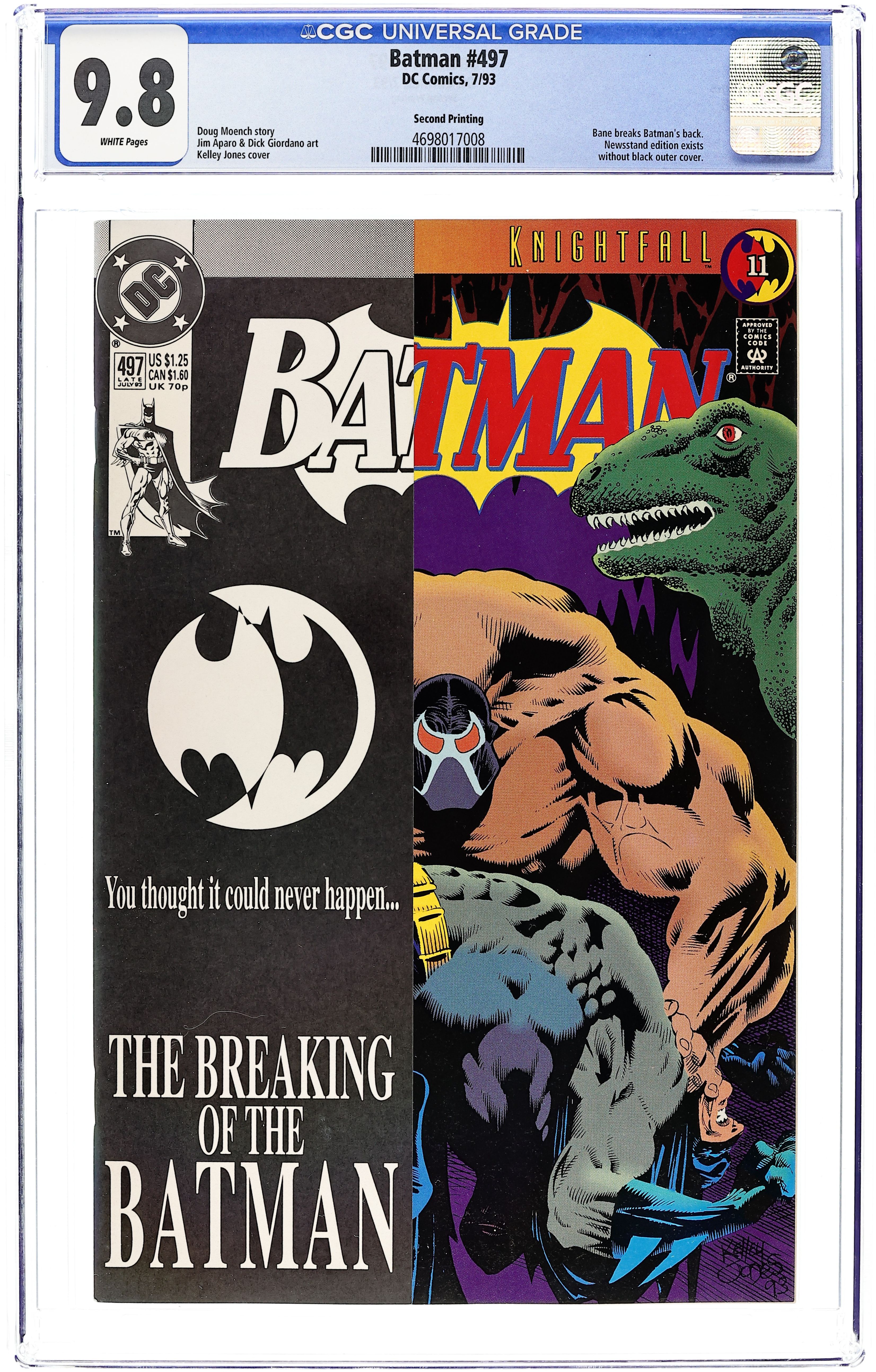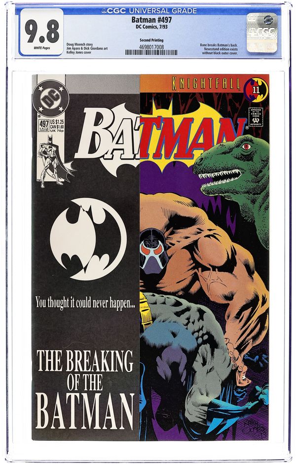 Second or later printing. May or may not have partial overlay cover. Written by Doug Moench. Pencils by Jim Aparo. Inks by Dick Giordano. Cover by Kelley Jones. Bane breaks Batman's back in Batman KnightFall Part 11. Home turf does not prove an advantage when Bane breaks Batman's back in the Batcave in "The Broken Bat." KnightFall continues in Detective Comics (1937- ) #664. 36 Pages, Full Color. Cover price $1.25.