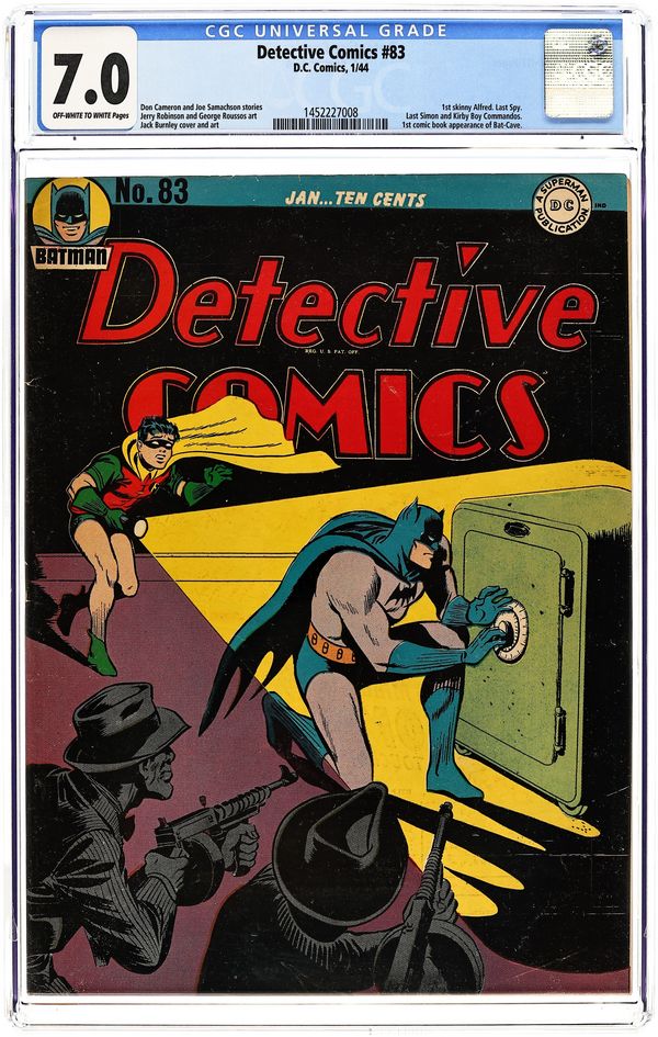 Cover art by Bob Kane, Jerry Robinson, and George Roussos. Batman and Hugo Strange story, script by Bill Finger, pencils by Bob Kane, inks by Bob Kane, Jerry Robinson, and George Roussos. Spy story, art by Ed Moore. The Case of the Circus Killer starring Larry Steele, Private Detective, art by Irwin Hasen. The Crimson Avenger story, script and art by Jack Lehti. Speed Saunders, Ace Investigator story, art by Ed Winiarski (as Fran Miller). Bargain Deaths starring Steve Malone, District Attorney, art by Don Lynch. Cliff Crosby story, script and art by Chad Grothkopf. Slam Bradley story, script by Jerry Siegel, art by Howard Sherman. 68 pgs. $0.10. Death of Hugo Strange, first time car called Batmobile. Gotham City 1st mentioned in Detective Comics. Cover price $0.10.