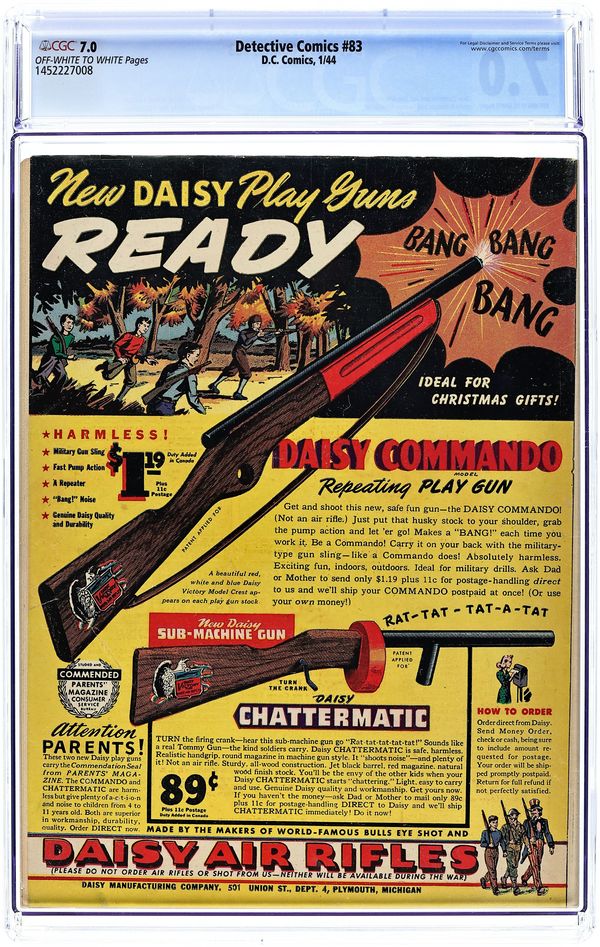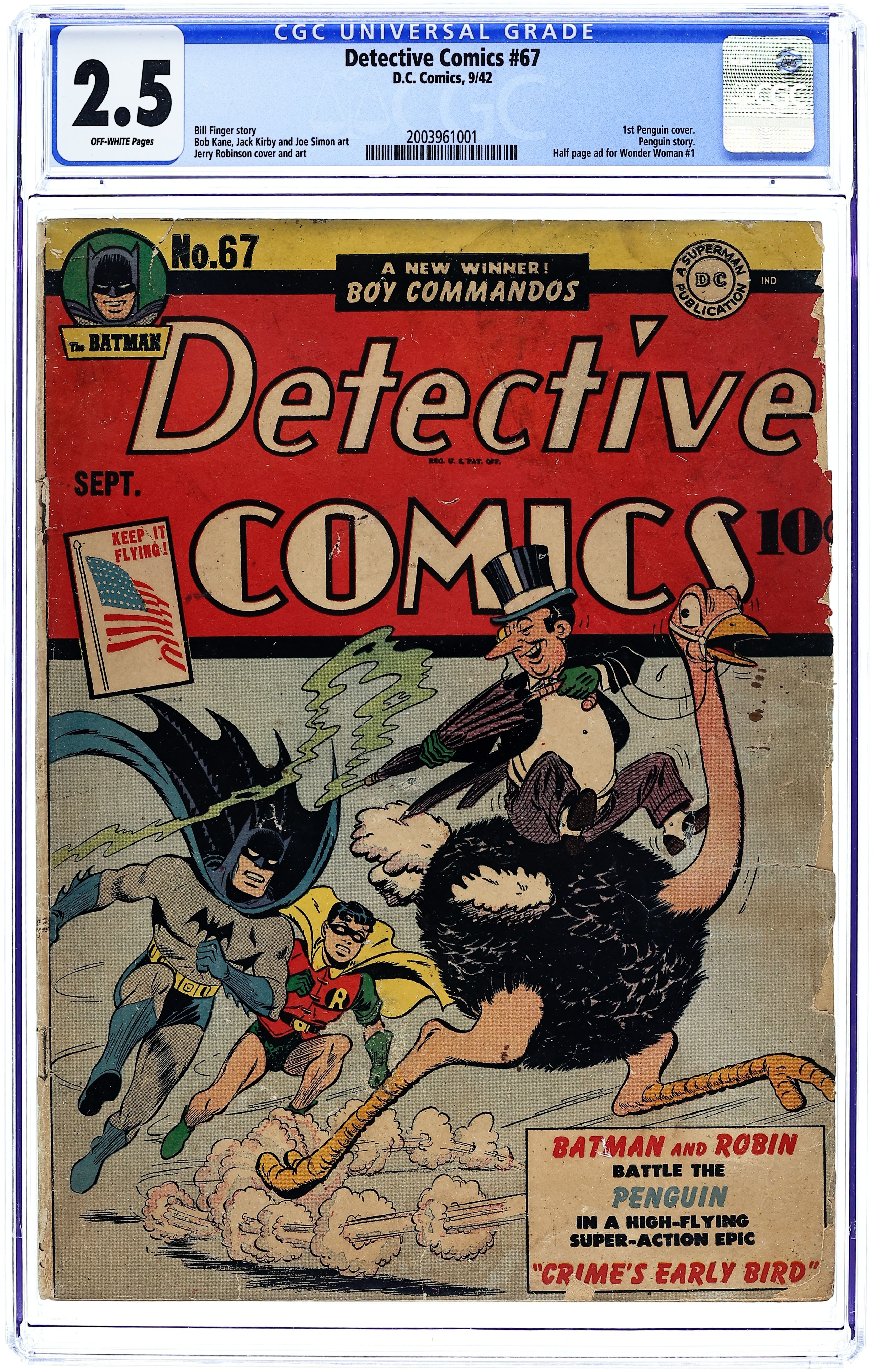 Cover by Win Mortimer. Stories by Bill Finger and unknown. Art by Bob Kane, Win Mortimer, John Daly, Lee Harris, Curt Swan and Steve Brodie. The Penguin, freshly escaped from prison, teams up with an unwitting bird enthusiast and uses the man's rare birds in the commission of crimes, as well as to capture Batman and Robin in "Fowl Play!" by Bill Finger, Bob Kane and Win Mortimer. Plus: Slam Bradley in "Shorty Grows Up!" with art by John Daly; Air Wave in "Safe-Cracker by Proxy" with art by Lee Harris; and The Boy Commandos in "The Fight Before Christmas!" with art by Curt Swan and Steve Brodie. Also: Prof. Pipp 2-pager by Jack Farr; Jerry the Jitterbug 1-pager by Henry Boltinoff; 2-page text story "Tune of Death" by Stan Carter; and The Rascals half-pager by Phil Berube. 52 pages, full color. Cover price $0.10.