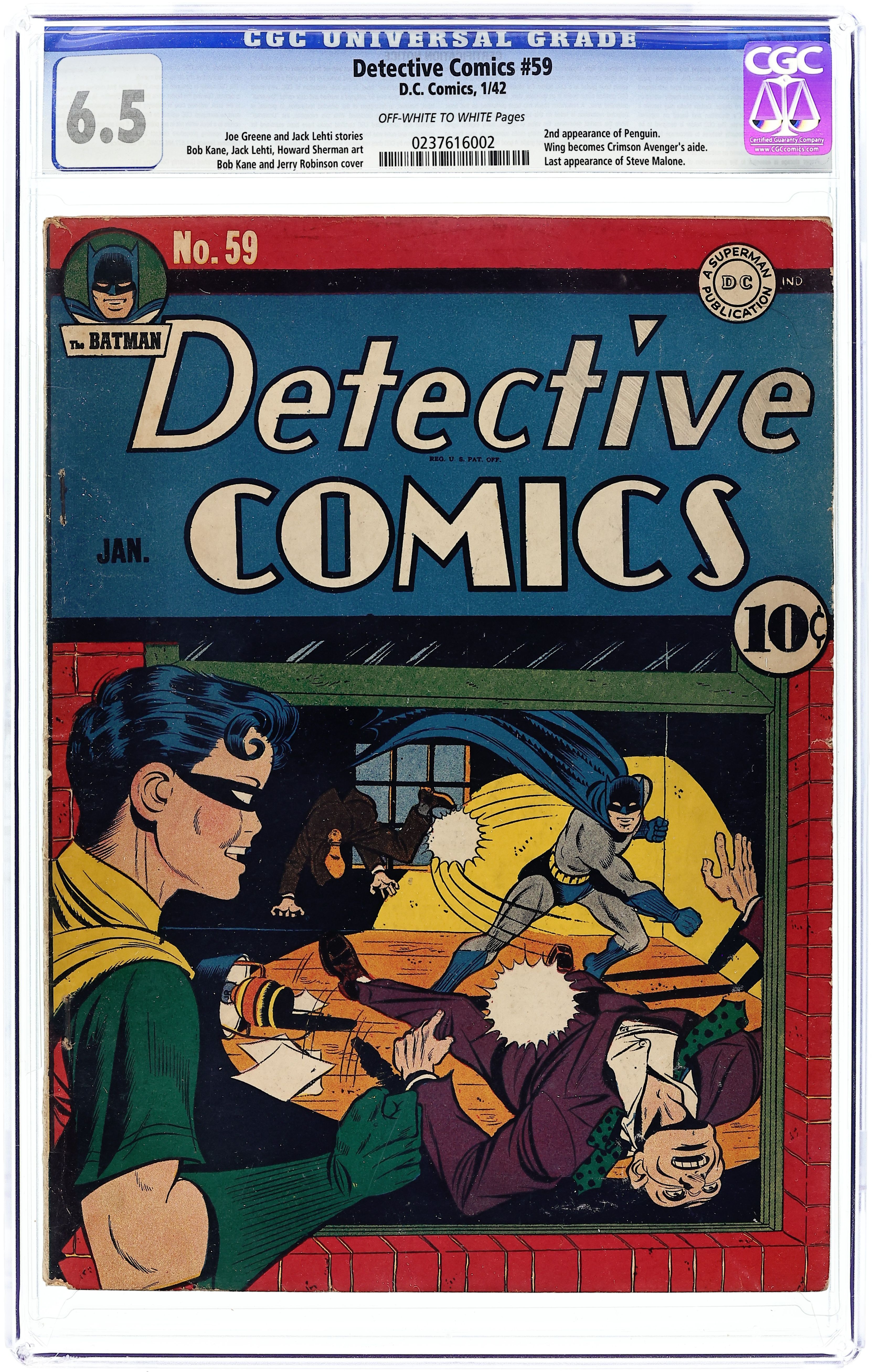 Cover art by Bob Kane and Jerry Robinson. Batman and Robin story, script by Bill Finger, pencils by Bob Kane, inks by Bob Kane and Jerry Robinson. Spy story, script by Jerry Siegel, art by Maurice Kashuba. Red Logan story, art by Ed Winiarski. The Crimson Avenger story, script and art by Jack Lehti. The Railroad Mystery starring Speed Saunders, Ace Investigator, art by Fred Guardineer. Theft at the Fair text story by Gardner F. Fox. Steve Malone, District Attorney story, art by Don Lynch. Cliff Crosby story, script and art by Chad Grothkopf. Slam Bradley story, script by Jerry Siegel, art by Howard Sherman. 68 pgs. $0.10. Robin's 1st solo. Cover price $0.10.