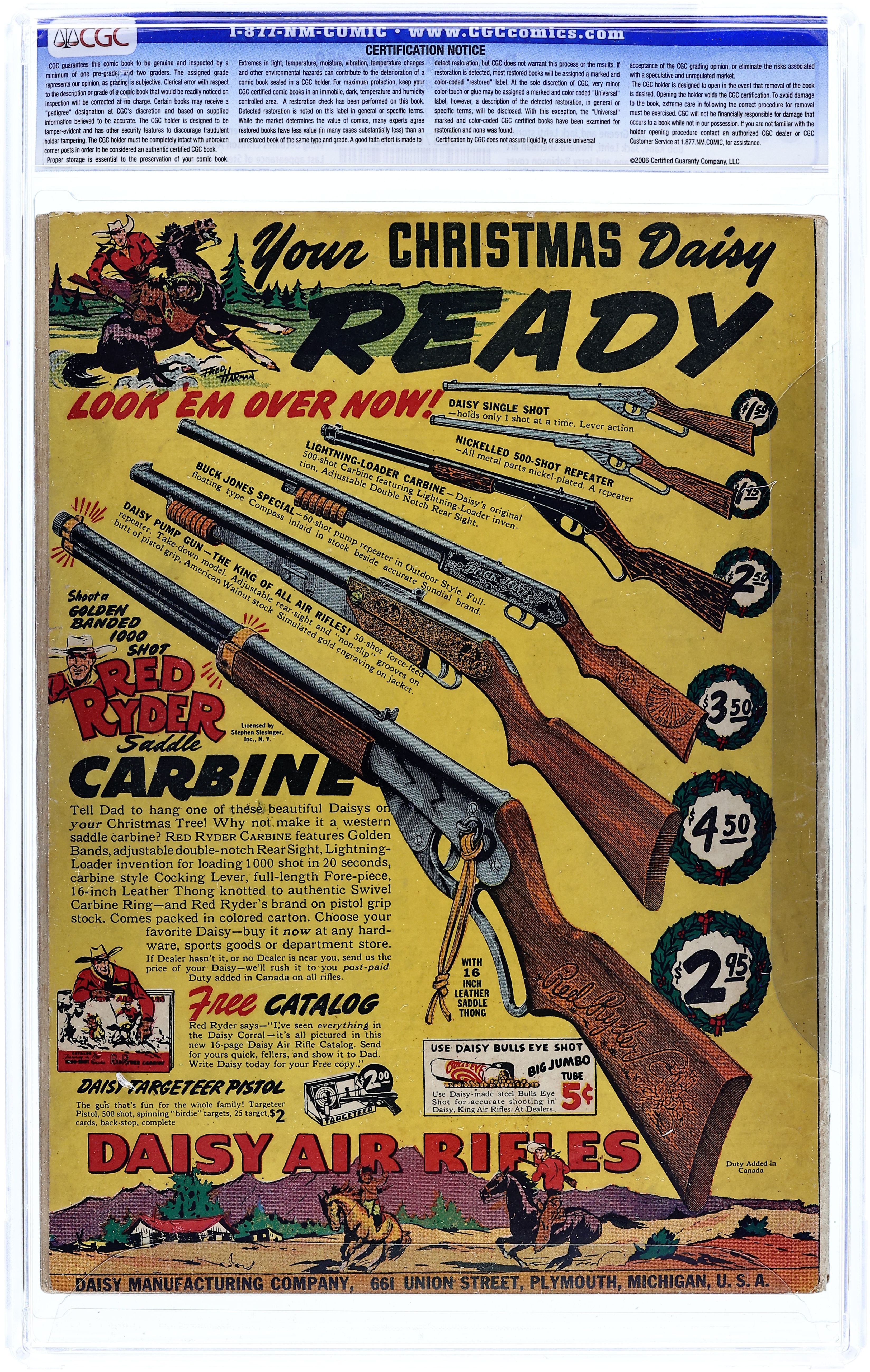 Cover by Win Mortimer. Stories by Edmond Hamilton, Don C. Cameron, Henry Boltinoff and unknown. Art by Bob Kane, Charles Paris, Carmine Infantino, Tom Cooke, Dan Barry, Henry Boltinoff and unknown. As they add trophy 1000 to the Bat-Cave's collection, the Caped Crusaders decide to check over the other trophies to make sure they are in good shape. They are called out on another case, bringing back trophy 1001 unaware that the evil Dr. Doom is hiding inside and plans to rig some of the trophies in the Bat-Cave to kill Batman and Robin in "The Thousand and One Trophies of Batman!" by Edmond Hamilton, Bob Kane and Charles Paris. Plus: Pow-Wow Smith, Indian Lawman in "The Brave Who Was a Coward!" with story by Don C. Cameron and pencils by Carmine Infantino; Robotman in "Felony and Fun!" with art by Tom Cooke; Impossible -- But True! tale "The Impossible Murder Case!" (featuring Roy Raymond) with art by Dan Barry; and Dover and Clover in "Clue Crazy!" by Henry Boltinoff. Also: 2-page text piece "Winner Take All No 2," and Little Pete 1-pager by Boltinoff. And: 1-page public service announcement "Superman's Code for Buddies" by Jack Schiff and Al Plastino. 52 pages, full color. Cover price $0.10.