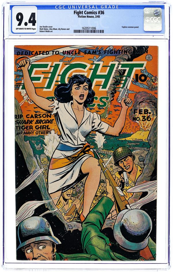Ends Apr 13 8:02 PM CST Bid History 5 bids Current Bid $280 Your Secret Max Bid If you'd like to bid, please log in or register. Cover by Joe Doolin. Edited by Jack Byrne and Jerry Iger. Stories and art by Robert Webb, Ann Brewster, Alex Blum, Lily Renee and Matt Baker. A combat-themed anthology from Fiction House that featured early work from many future comics legends (often uncredited) in the Eisner-Iger Shop. Tiger Girl battles a mad Dr. Moreau-type who turns jungle animals into half-human creatures; Hooks Devlin investigates a strange murder in the trick-riding ring of a county fair. Glamour-girl turned super-spy Senorita Rio battles escaped Nazi war criminals who plan to replace her with a duplicate. Featuring art by famed good-girl artist Matt Baker and pioneering female artist Lily Renee. Another creative bondage cover, this one involving a paddle-wheel boat. Flying Jeep; Tiger Girl; Rip Carson; Hooks Devlin; Senorita Rio; Shark Brodie. 36 pages, Full Color. Cover price $0.10.