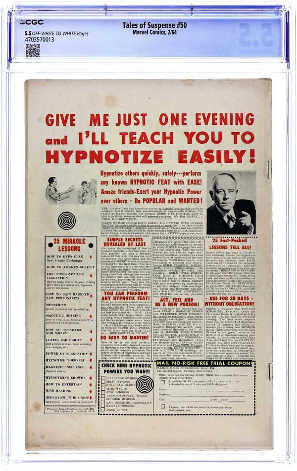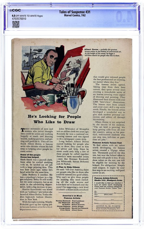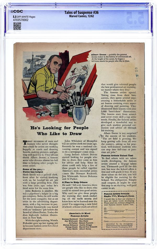 Ends Apr 15 8:20 PM CST Bid History 6 bids Current Bid $52 Your Secret Max Bid If you'd like to bid, please log in or register. Cover pencils by Jack Kirby, inks by Steve Ditko. First X-Men crossover (same date as X-Men #3 - January, 1964), plus first Avengers crossover (without Captain America) in the Iron Man story, "The New Iron Man Meets the Angel!", script by Stan Lee, pencils by Steve Ditko, inks by Paul Reinman; The Angel is affected by an atomic test done at one of Stark's weapons plants. His personality is altered and now he wants to join the Evil Mutants; The X-Men call the Avengers for help but only Iron Man is available. "Strange Encounter," art by Joe Maneely. "The Saga of the Sneepers!", script by Stan Lee (plot) and Larry Lieber (script), pencils by Larry Lieber, inks by George Roussos (as G. Bell); An alien race watches humanity's progress, worried that they will one day overtake them; With the invention of the atomic bomb and the Cold War, they decide that humanity will wipe itself out before it poses a threat. 36 pages, full color. Cover price $0.12.