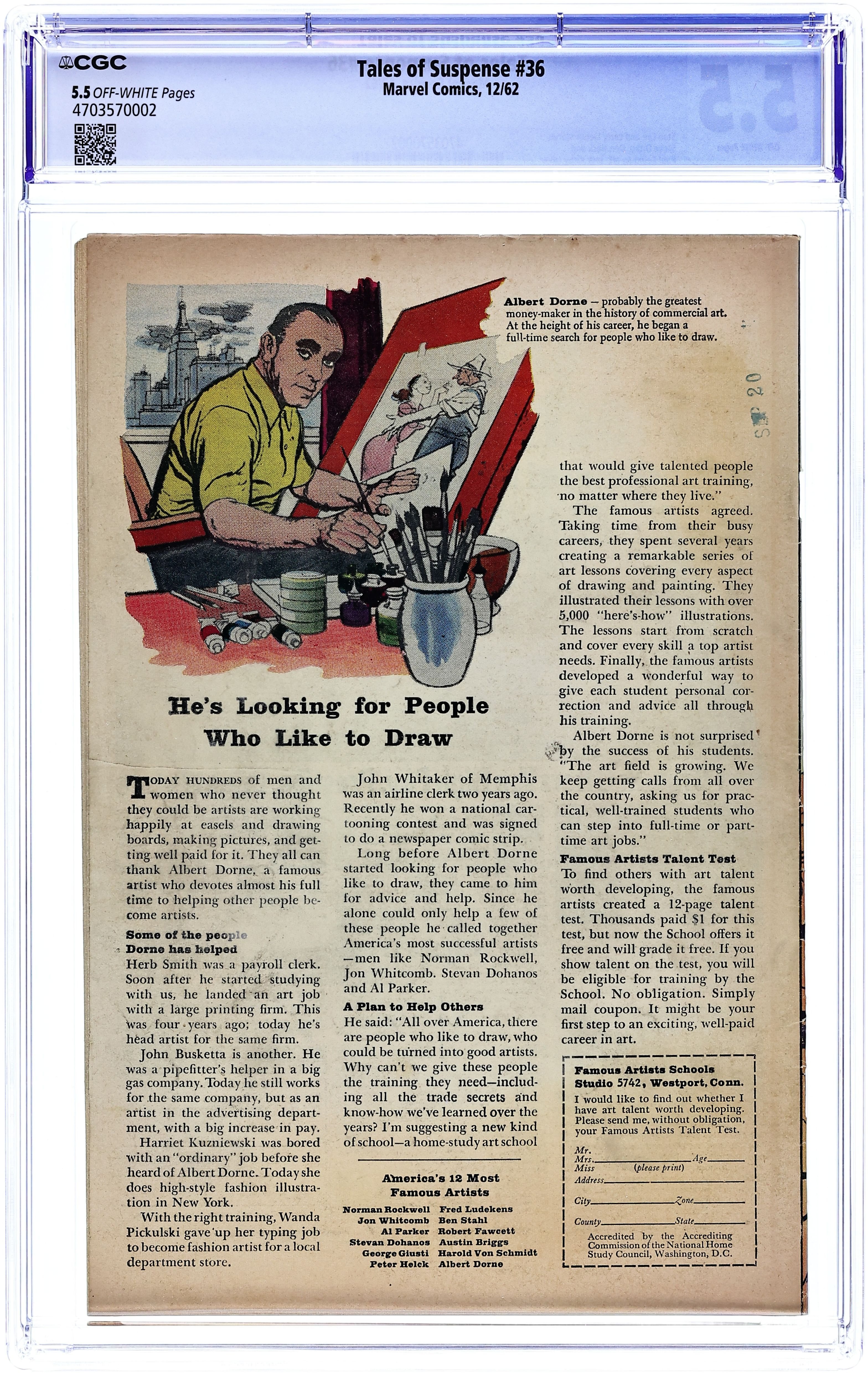 Cover pencils by Jack Kirby, inks by Steve Ditko. "I Found the Girl in the Blue Glass Bottle!", pencils by Jack Kirby, inks by Dick Ayers; A curio shop owner uses an ancient magic bottle to shrink people, but one of his victims turns the magic of the bottle on him and escapes, as the shop owner shrinks to nothing. "Tricky Travel" text story. "The Forbidden World!", pencils by Jack Kirby, inks by Dick Ayers; A space patrol find an alien world surrounded by a strange mist. "The Coming of the Giants!", art by Don Heck; The humanity of the near future grow proud as they approach space travel, but when alien giants arrive they are only saved from conquest because they are too tiny to notice. "Who Am I?", script by Stan Lee, art by Steve Ditko; A man finds himself lost in a fog with no idea who he is; He is approached by a stranger who offers to help him through hypnosis; The hypnosis recovers his lost memory and he realizes that he was a circus performer who has died from a fall from the high wire. 36 pgs., full color. $0.12. Cover price $0.12.
