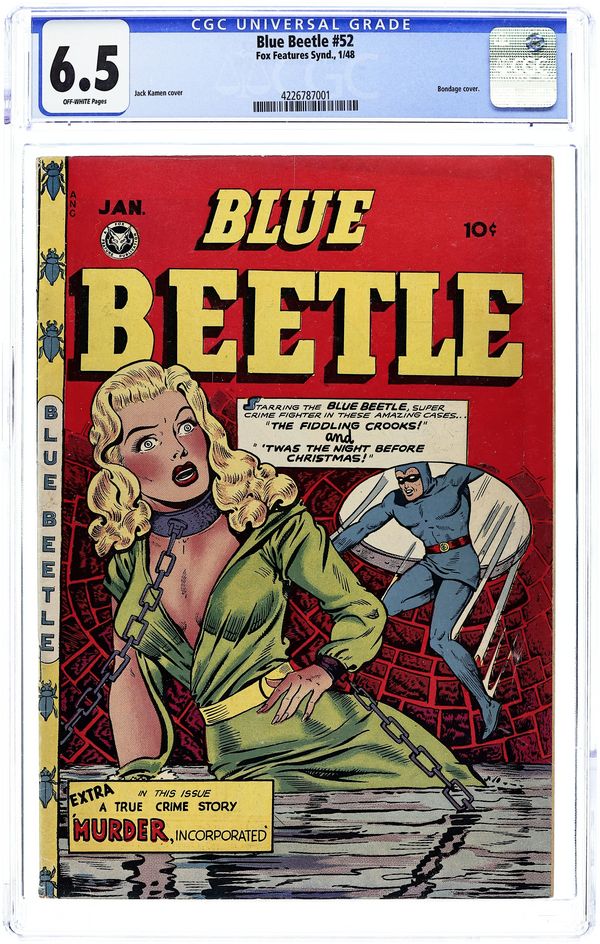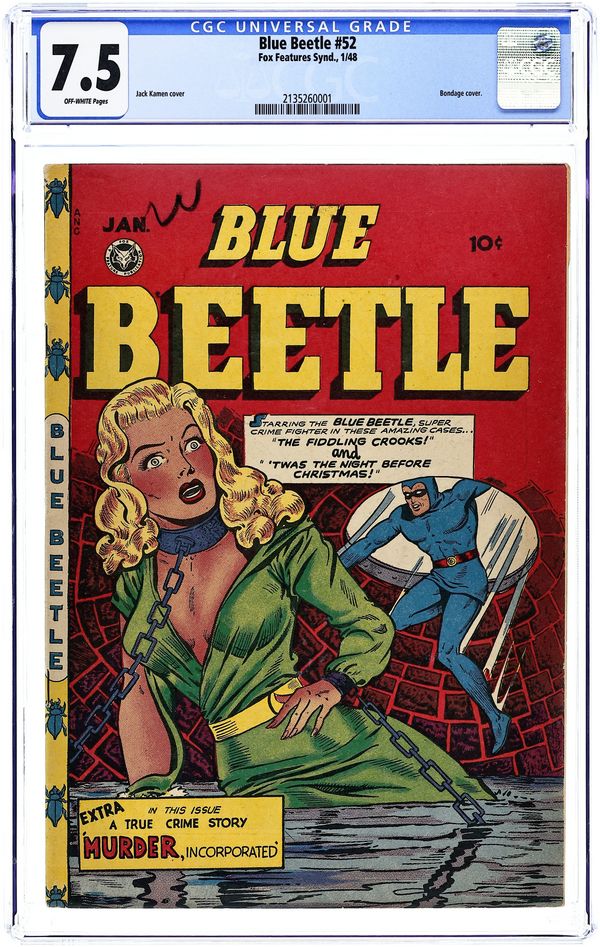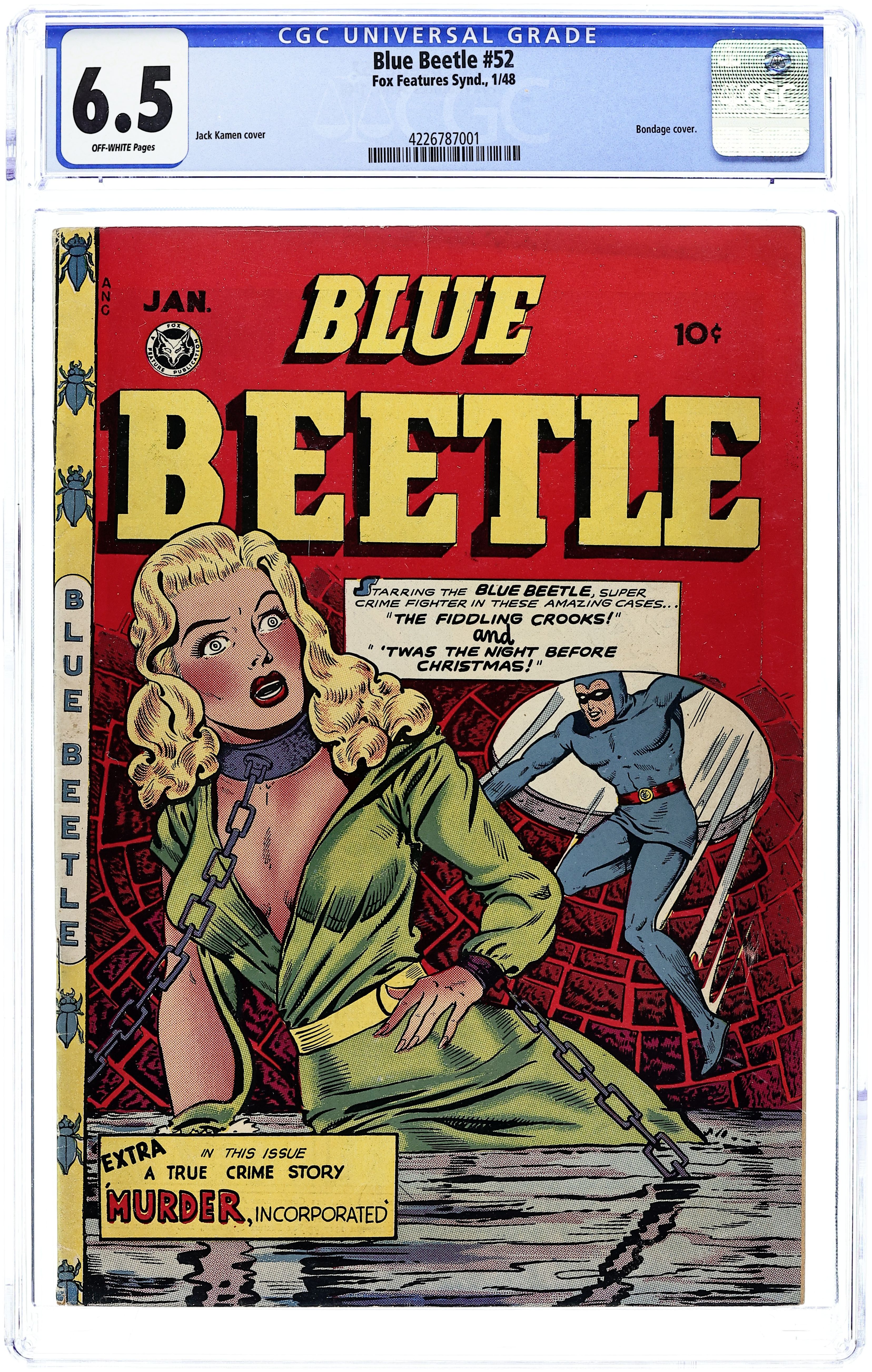Stories by Ed Lane and others. Art by Jack Kamen and others.. Fox Feature Syndicate presents the first series featuring the original version of the Blue Beetle. A Blue Beetle Christmas story; The Blue Beetle tells the true story of the organized crime gang Murder Incorporated. Featuring an action-packed bondage cover by an unknown artist. The Fiddling Crooks!; Twas the Night Before Christmas; Murder O'Clock; Sadie Krum, Girl Bandit; Murder Incorporated. 36 pages, Full Color. Cover price $0.10.
