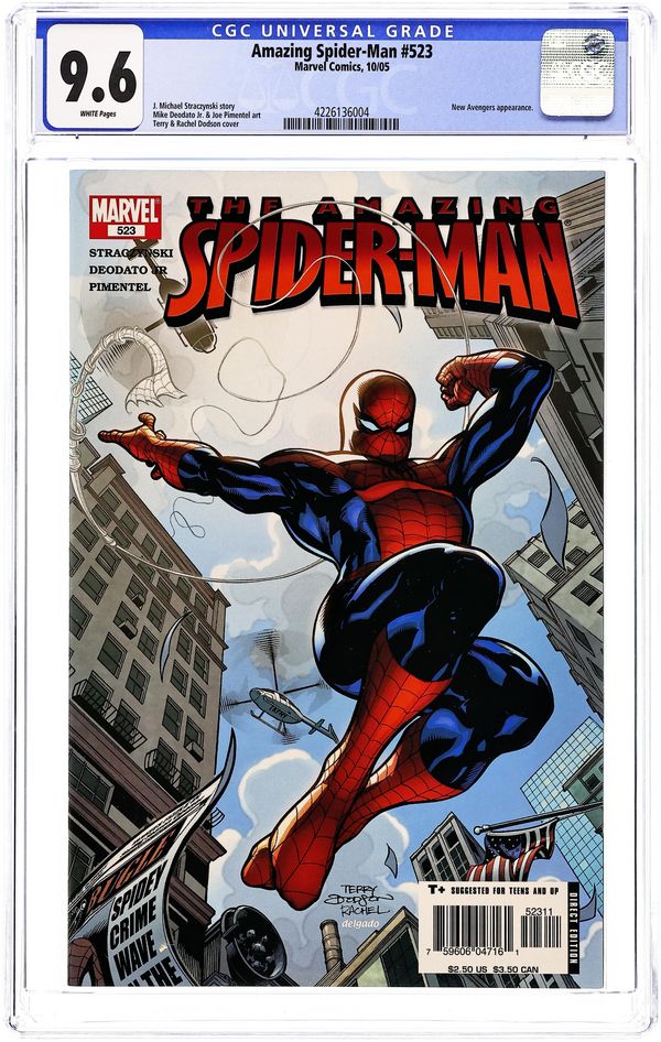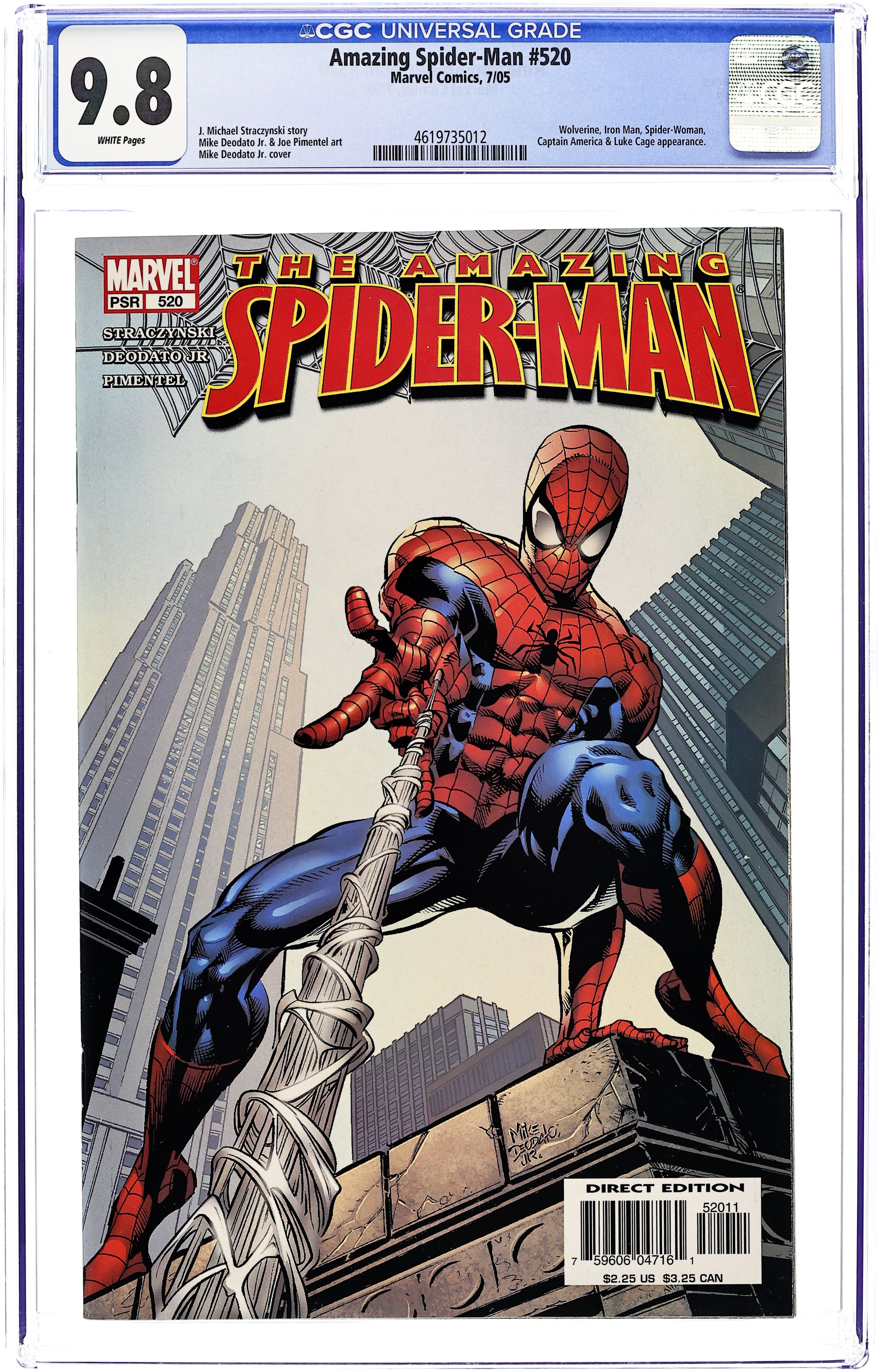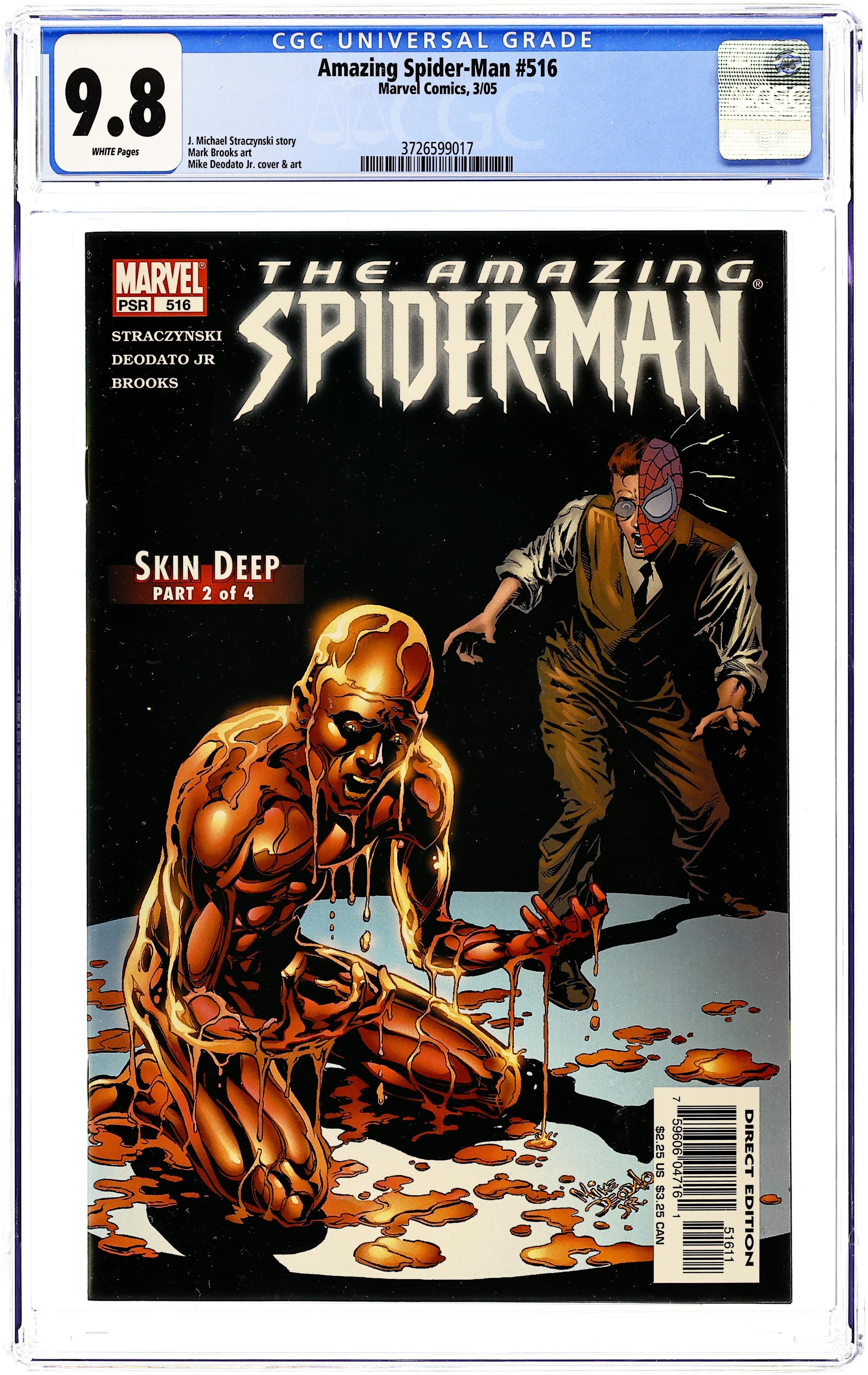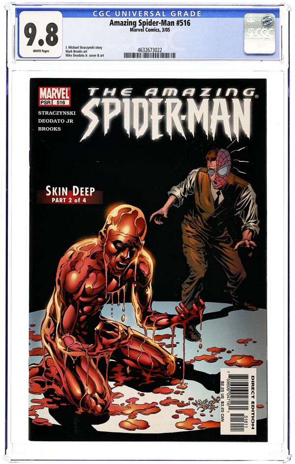 Direct Edition. Written by J. Michael Straczynski. Art by Mike Deodato, Jr., Mark Brooks, Joe Pimentel and Jaime Mendoza. Cover by Mike Deodato, Jr. "Skin Deep" Another pulse-pounding issue of ASM done in the stupendous Straczynski style! Peter must confront a foe who? Like himself? Was given amazing powers during a science experiment gone awry. But why does this adversary blame Peter for the mishap in the laboratory? and just how far will he take his quest for vengeance? Part 2 (of 4). 44 PGS. Cover price $2.25.
