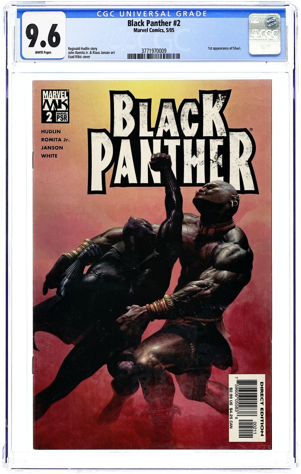 1st appearance of Shuri (later becomes the new Black Panther). Written by Reginald Hudlin Penciled by John Romita Jr. Cover by Esad Ribic "WHO IS THE BLACK PANTHER?" The Wakandan super hero is back with Hollywood heavyweight Hudlin (HOUSE PARTY, BOOMERANG) and fan favorite Romita Jr. (WOLVERINE, AMAZING SPIDER-MAN,) teaming up to deliver a book that's sure to excite true believers. The Black Panther's origin is retold in a cinematic scope with social satire and all-out action. "Who is the Black Panther?" Part 2: While a team of super-powered mercenaries prepares their assault on Wakanda, a contest is underway in that warrior kingdom: Who will be the next Black Panther? Part 2 (of 6). 32 PGS./Marvel PSR ...$2.99 Cover price $2.99.
