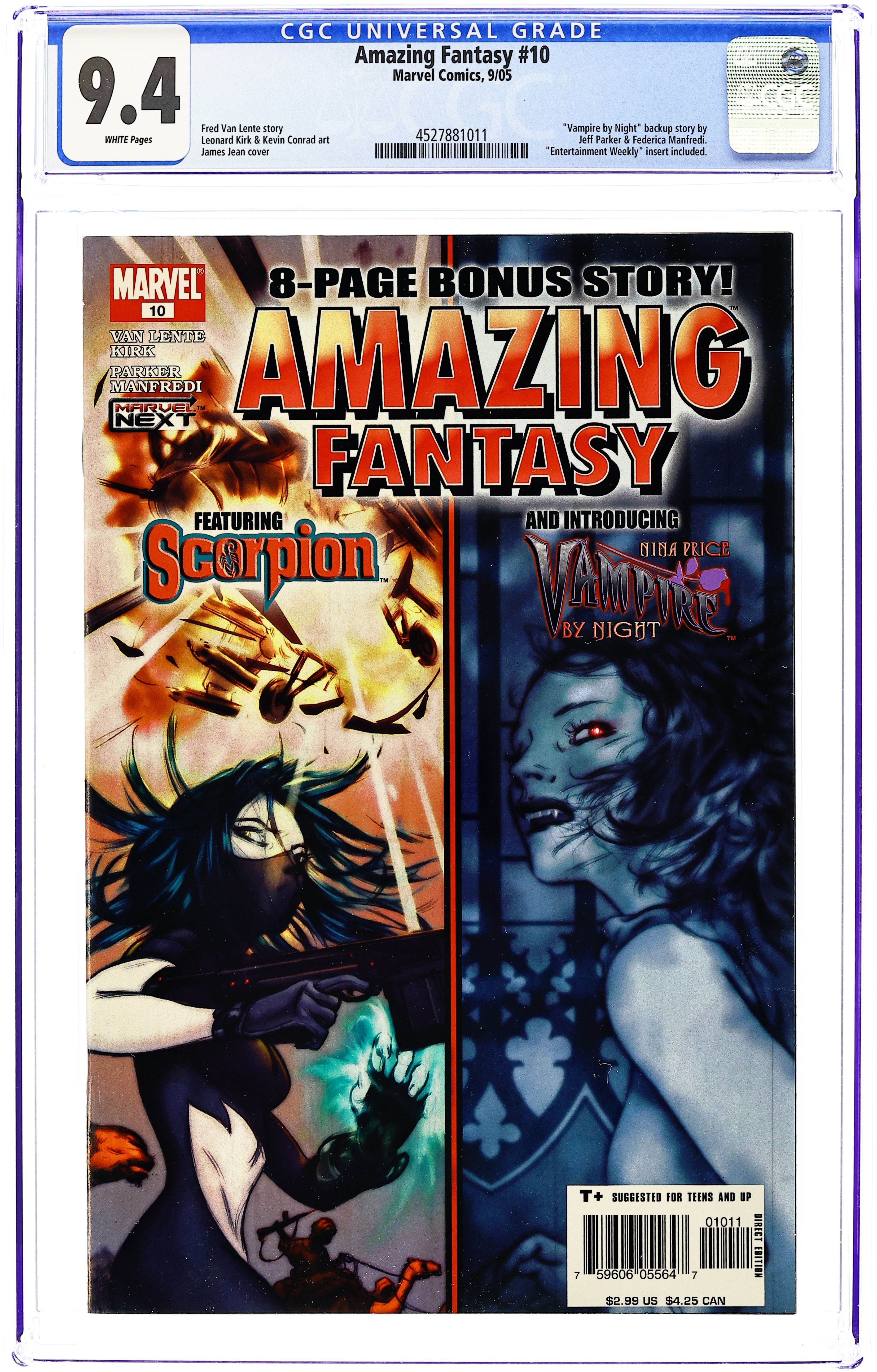 Newsstand Edition. Written by FRED VAN LENTE Penciled by LEONARD KIRK Cover by JAMES JEAN The fans spoke and Marvel listened. The winner of the Marvel.com poll for characters fans wanted to see revamped makes her astonishing debut! Amazing Fantasy #7 is proud to present the all-new, all-different SCORPION! After the vicious murder of her adoptive parents, Carmilla Black discovers her biological mother is the top scientist of the worldwide terrorist network, A.I.M. Now, to unravel the secrets of her true identity and mysterious power, she's hot on the heels of her enigmatic mother, with S.H.I.E.L.D. hot on her trail, hoping she'll lead them right to the terrorists' leadership! Part (1of 6) 32 PGS./Marvel PSR ...$2.99 Cover price $2.99.