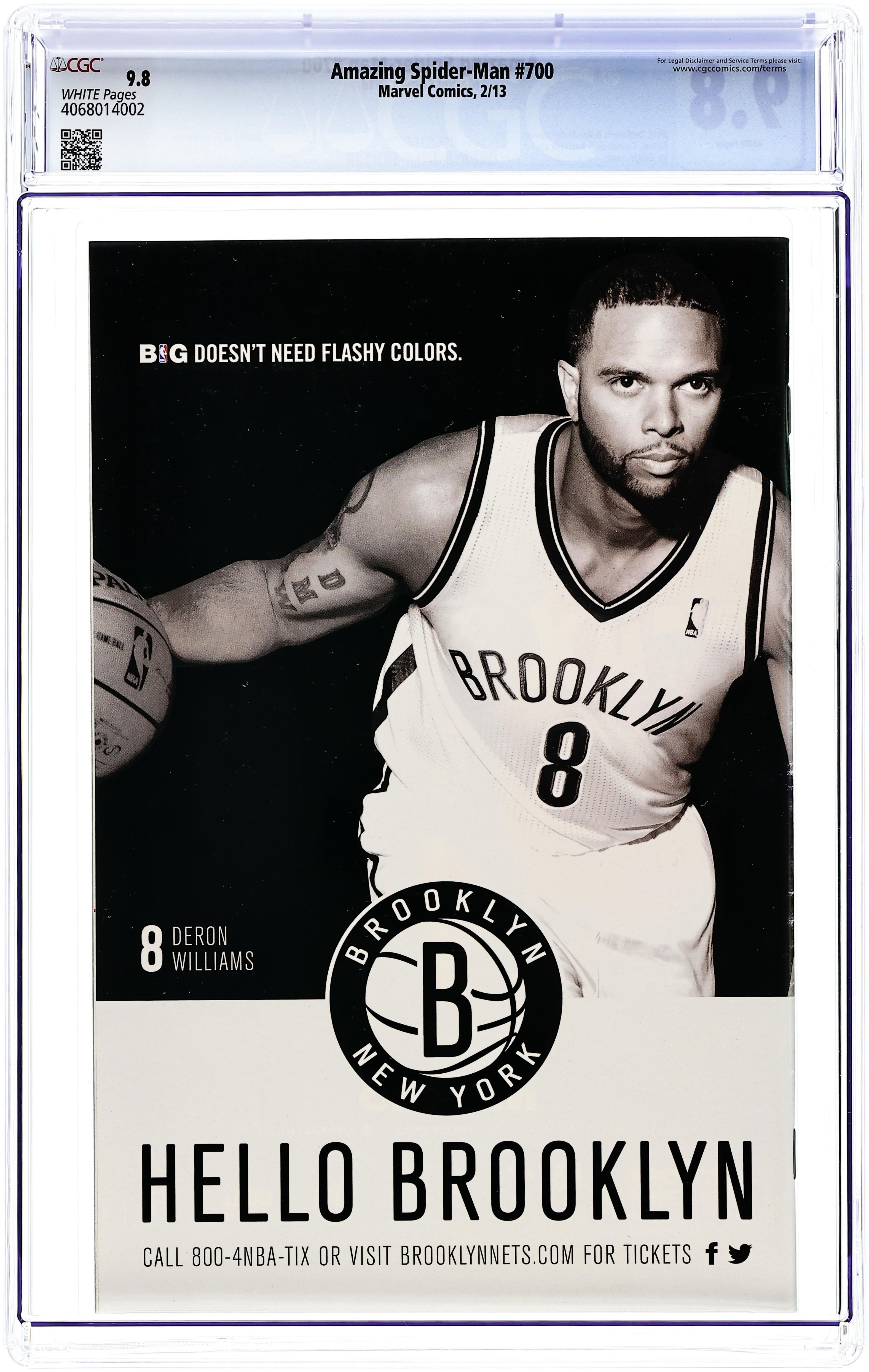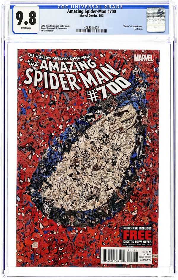 Direct Edition. Dying Wish: Part 2 of 2. Written by Dan Slott, J.M. DeMatteis and Jen Van Meter. Art by Humberto Ramos, Giuseppe Camuncoli, Stephanie Buscema, Victor Olazaba and Sal Buscema. Cover by Mr Garcin. Marvel Comics proudly presents the end of a 700 issue era! Featuring "Dying Wish: Suicide Run" by Dan Slott, Humberto Ramos and Victor Olazaba. Plus these extra amazing, spectacular and sensational stories: "Spider-Dreams" by J.M. DeMatteis, Giuseppe Camuncoli and Sal Buscema, and "Date Night: A Black Cat Storybook Adventure!" by Jen Van Meter and Stephanie Buscema. Also: cover gallery featuring all 700 Amazing Spider-Man covers; special previews of the all-new Spidey books; and the final Amazing Spider-Mail featuring Stan "The Man" Lee answering your questions! 104 pages, full color. Rated T+ Cover price $7.99.
