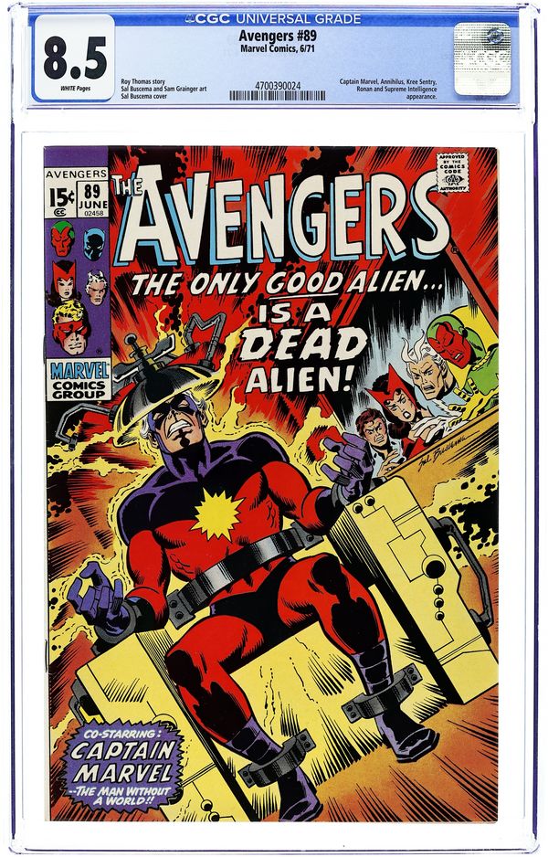 "The Only Good Alien... " Part 1 of 9. Guest-starring Captain Marvel. Script by Roy Thomas. Pencils by Sal Buscema. Inks by Sam Grainger. Cover by Sal Buscema. The classic Kree/Skrull War storyline starts with a bang as Earth's Mightiest Heroes and Rick Jones pursue Captain Marvel on the streets of Miami! Wow, why are the Avengers chasing the Kree Warrior? Especially after Wanda, Pietro, and the Vision just fought alongside him several hours ago in the Baxter Building vs. Annihilus! Dangerously though, the cosmic superhero's body is teeming with deadly radiation after spending too much time in the Negative Zone! Once the Avengers capture Captain Marvel, they take him to Cape Canaveral in hopes of saving his life! Meanwhile on Hala, the Kree homeworld, Ronan the Accuser leads a rebellion against the Supreme Intelligence! Ronan's actions will have immediate and far-reaching effects on the Milky Way Galaxy and of course Earth's Mightiest Heroes! Cameo appearance by Sentry 459. Flashback cameo by Mr. Fantastic to recap his escape from the Negative Zone in Fantastic Four 110. Avengers Lineup: Quicksilver, Scarlet Witch, and the Vision. (Notes: Captain Marvel's participation in the Kree/Skrull War occurs while his own series was on a 2-year hiatus. Ronan previously appeared in Captain Marvel 16. Annihilus appears next in Marvel Team-Up 2. The full Kree/Skrull War saga was reprinted in 2000 in the trade paperback: The Avengers -- The Kree-Skrull War.) 36 pages. Cover price $0.15.