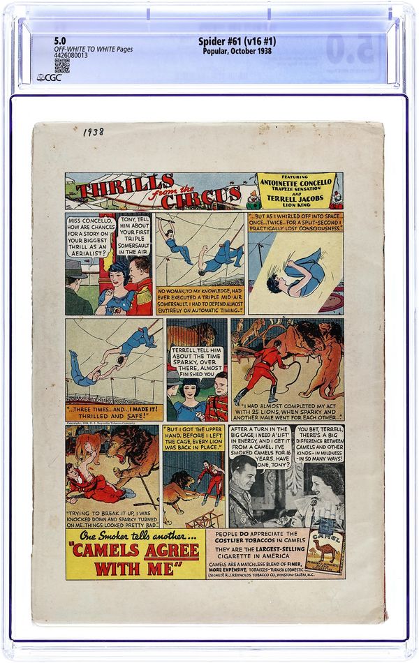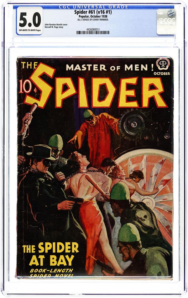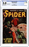 Oct 1938. Cover by John Howitt. Spider Story by Grant Stockbridge "The Spider at Bay". "Never Bet on a Corpse" by J. Lane Linklater and "The Witness From Hell" by Arthur Leo Zagat. Crime-fighting article by Moran Tudury. Illustrations by J. Fleming Gould. 7" x 10", black and white; 112 newsprint pages. Cover price $0.10.