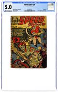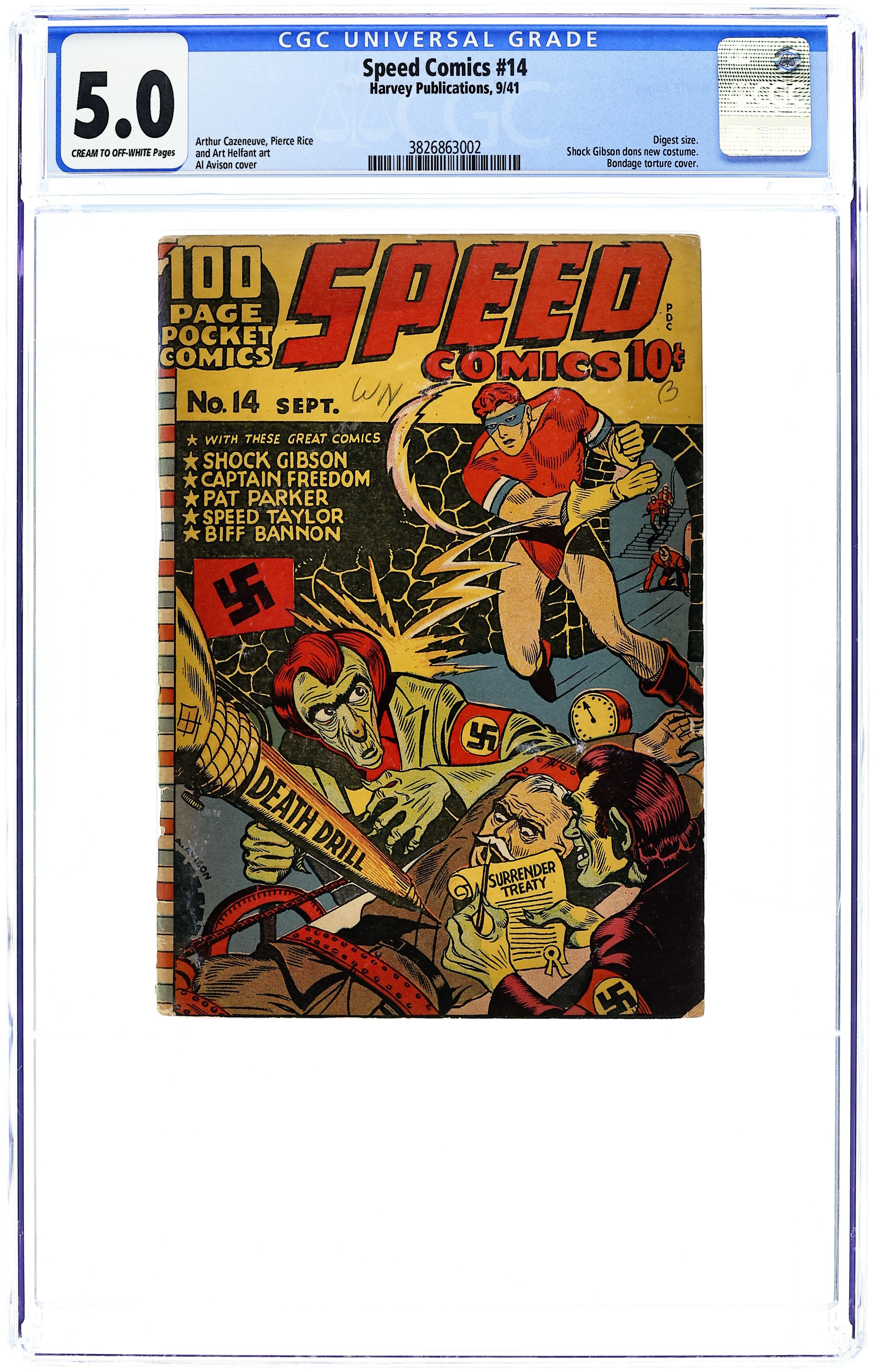 Cover art by Al Avison. The Dome of Death starring Shock Gibson and Adolph Hitler. Captain Freedom & Young Defenders story. Bimbo's Beanery story, script and art by Art Helfant. Pat Parker story. Biff Bannon story, script and art by Art Helfant. Shock Gibson and the Room of Death text story. Speed Taylor story with Professor Shultz. Crash, Cork, and the Baron story. Ted Parrish story, art by Arthur Cazeneuve. 100 pages, four color. Cover price $0.10.