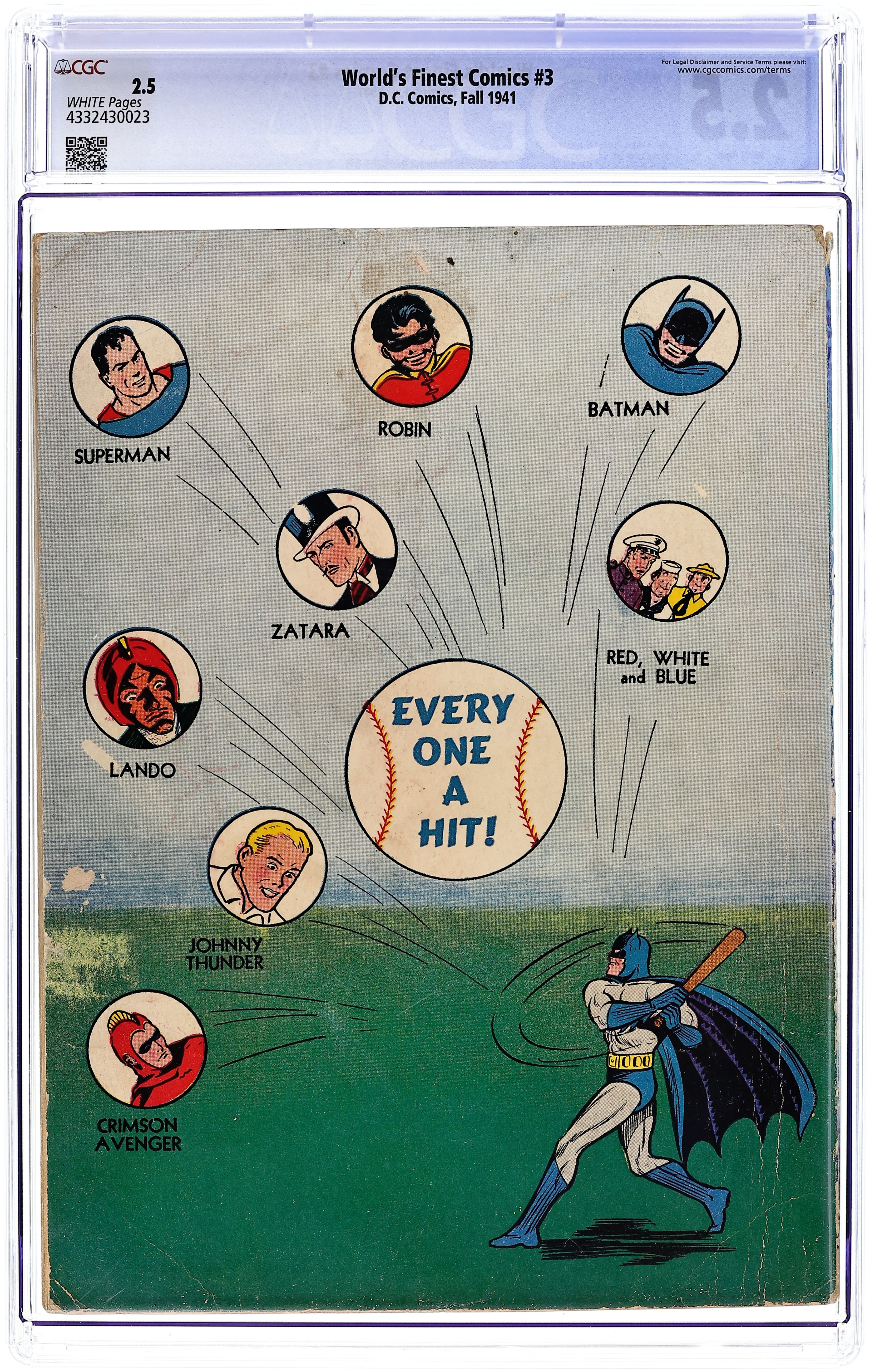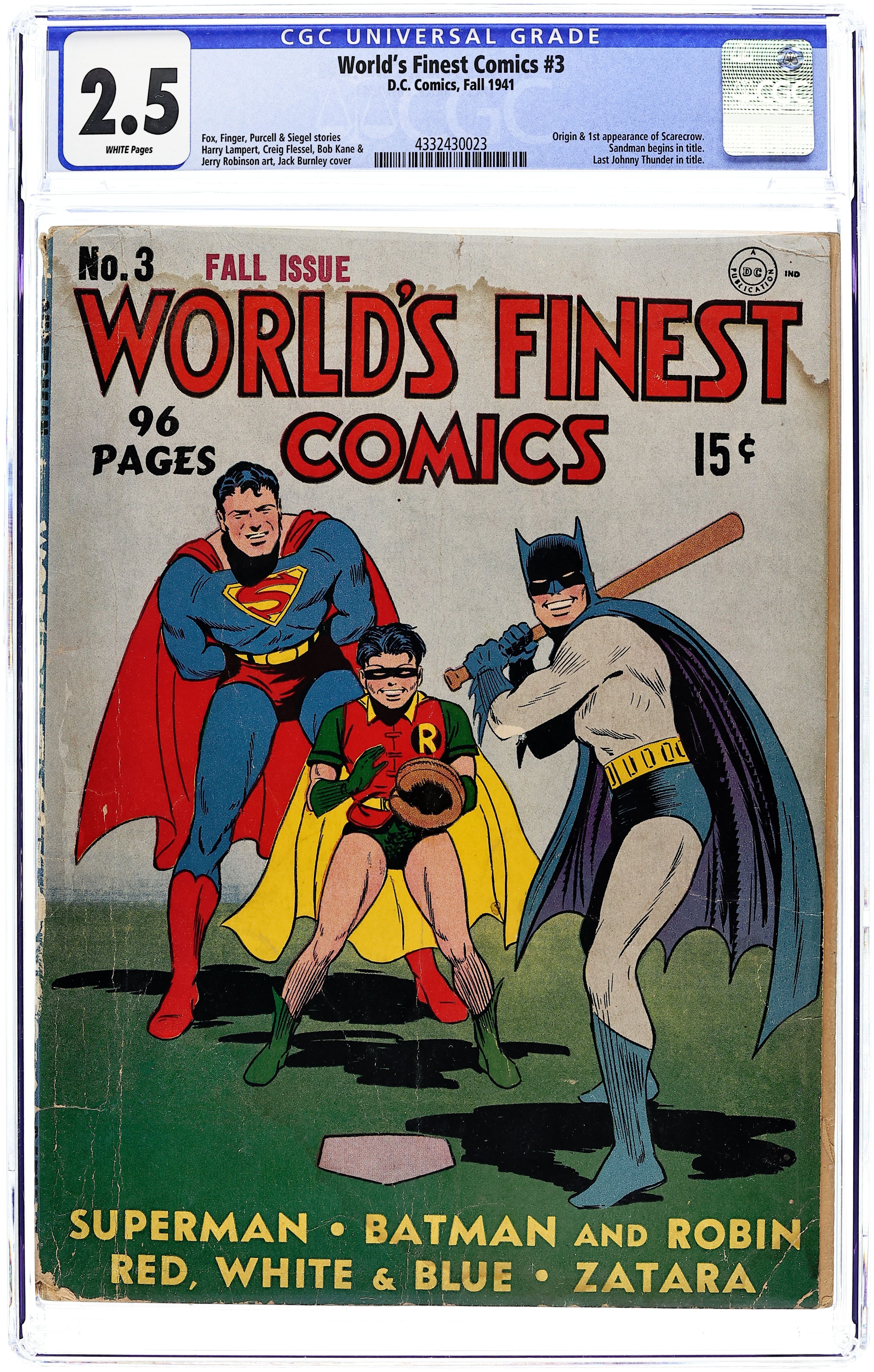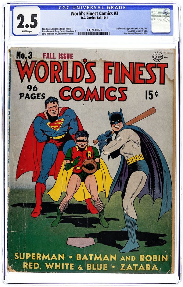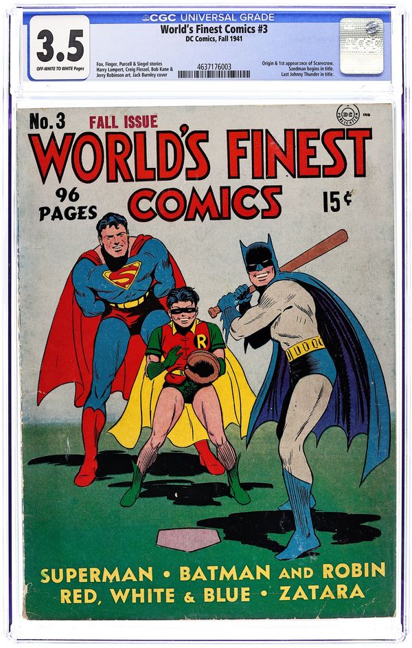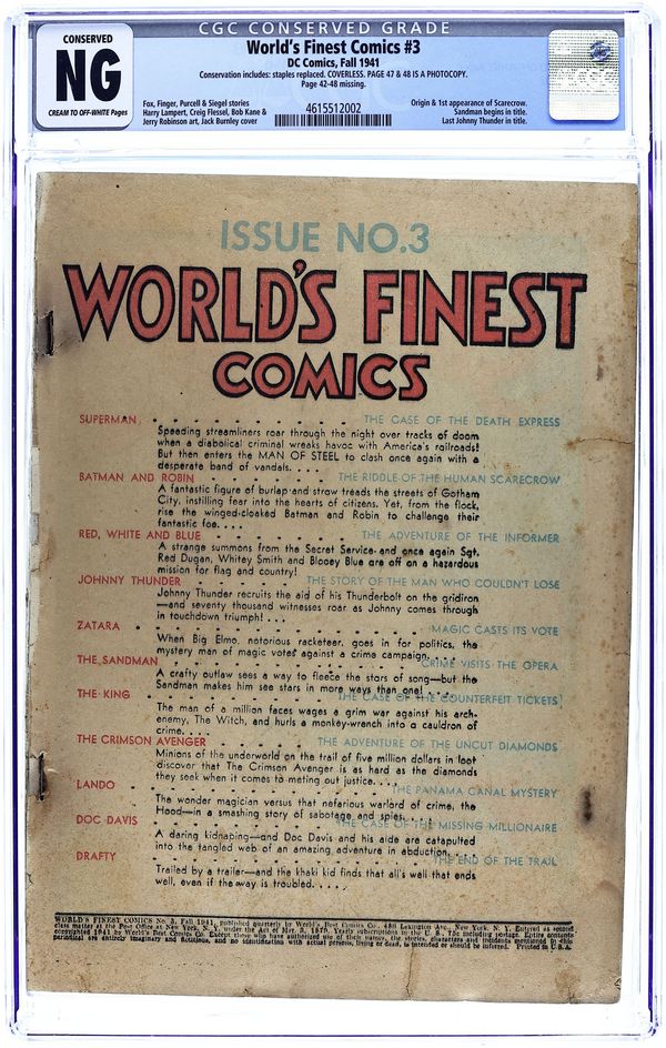 Cover art by Fred Ray. The Case of the Death Express, script by Jerry Siegel, art by Leo Nowak [as Joe Shuster]; Clark Kent [a.k.a. Superman] investigates a series of railroad accidents that turn out to be anything BUT accidental! The Adventure of the Informer starring Red, White and Blue, art by Howard Purcell. The Adventure of the Uncut Diamonds starring The Crimson Avenger, script by Jack Lehti, art by Paul Norris. The Story of the Man Who Couldn't Lose starring Johnny Thunder, script by John B. Wentworth, art by Stan Aschmeier. The Case of the Missing Millionaire starring Young Doc Davis, script and art by Henry Boltinoff. Magic Casts Its Vote starring Zatara, script by Gardner F. Fox, art by Joseph Sulman. Crime Visits the Opera starring The Sandman, pencils by Creig Flessel, inks by Chad Grothkopf. The Case of the Counterfeit Food Tickets starring The King, script by Gardner F. Fox, art by Harry Lampert. The Panama Canal Mystery starring Lando, Man of Magic, art by Howard Purcell. Riddle of the Human Scarecrow! starring Batman and Robin, script by Bill Finger, pencils by Bob Kane (signed) and Jerry Robinson (on secondary figures only), inks by George Roussos. 100 pages, Full Color. Cover price $0.15.