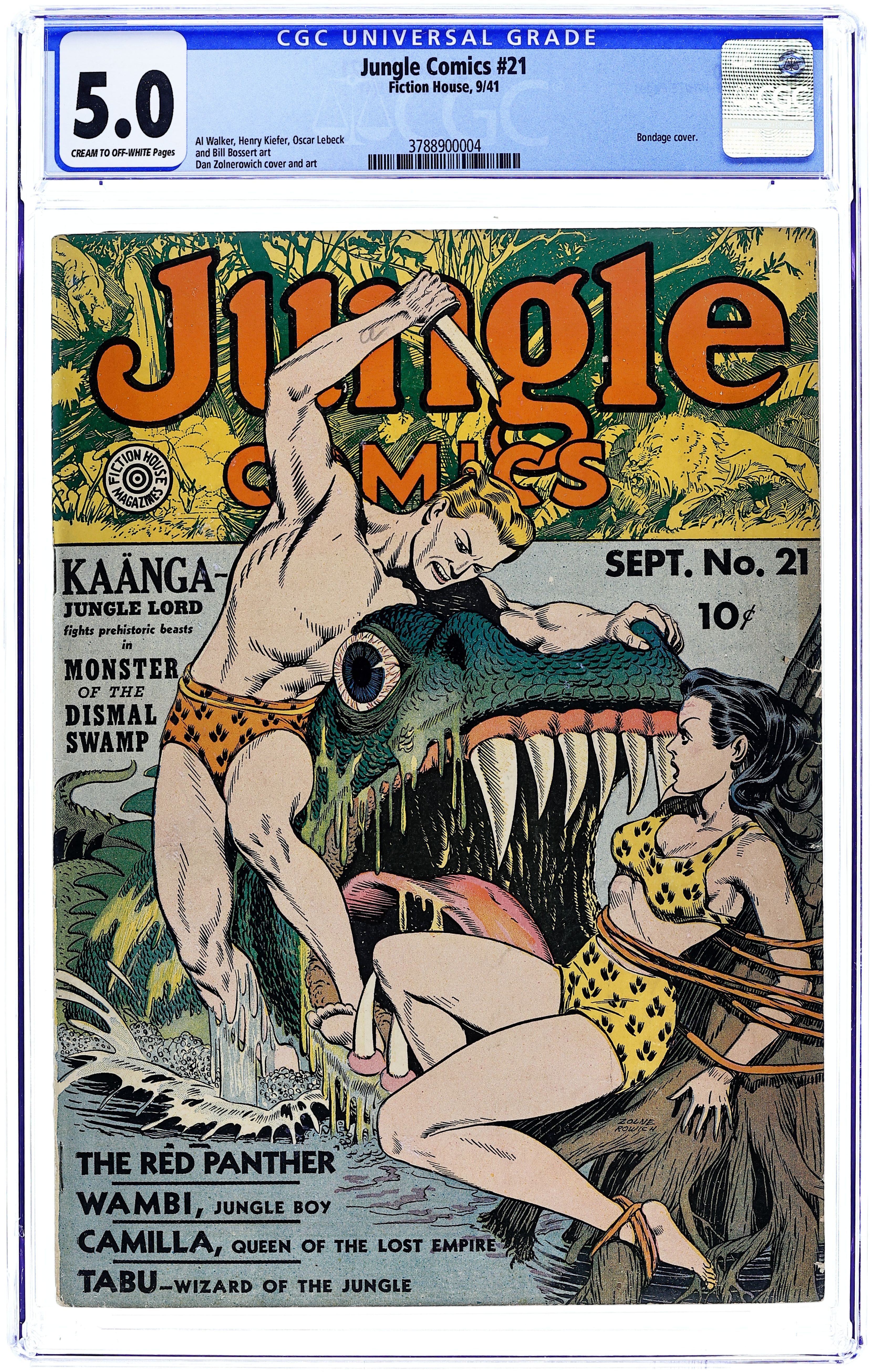 Cover art by Dan Zolnerowich. "Monster of the Dismal Swamp," art by Dan Zolnerowich; KaƤnga puts an end to human sacrifices to appease the Storm Monster by killing the beast. Untitled story, art by Al Gabriele; The Panther rescues a geologist and a pilot from pygmies and then helps them find a large radium deposit. Untitled story; Tabu rescues a boy from a vulture worshiping cult. Untitled story; After being kidnapped and taken to India by slavers, Fantomah escapes and meets Kalat, a friendly native whose people are beset by cobra cultists. "The Reaching Death" text story. Untitled story; Anderson, Kismet, and Vincent each dream that Terry is their slave after Terry punishes them by making them do chores. Untitled story, art by Al Walker; Simba rescues a hunter's son from a gorilla. Untitled story, art by Henry Kiefer; Wambi and his jungle friends help a planter escape from a pair of contract killers. Untitled story; Camilla induces a tribe of pygmies to help her liberate Eric from Arabs who are holding him. Untitled story, art by Seymour Reit; Determined to capture the famous Crocodile Marsh on film, Roy's friend, Art, antagonizes the Tutan tribe before Roy manipulates the natives into thinking that a movie camera is a weapon. 68 pgs., full color. Cover price $0.10.