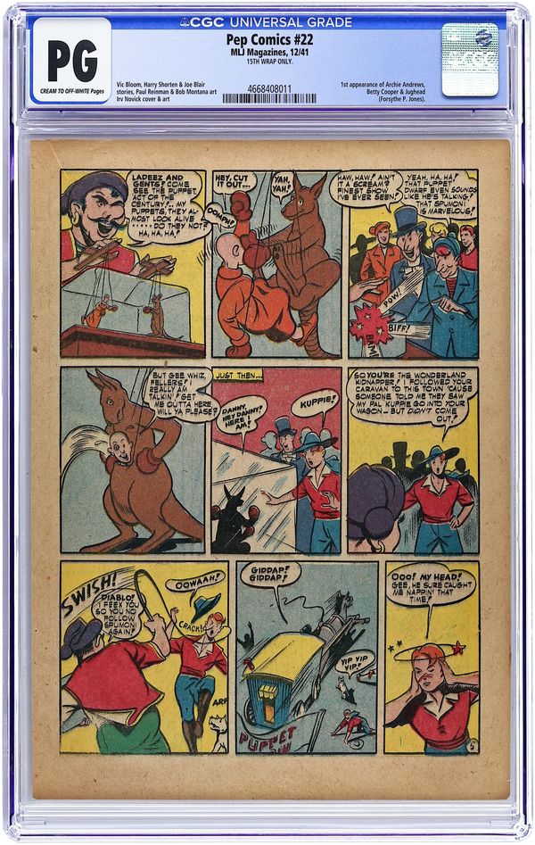 First appearance of Archie, Betty and Jughead. Cover art by Irv Novick. Shield story, script by Harry Shorten, art by Irv Novick. Hangman story, script by Joe Blair, art by Paul Reinman. Danny In Wonderland story, script by Harry Shorten, art by Lin Streeter. Sergeant Boyle story, art by Carl Hubbel. Jolly Roger story, script by Joe Blair, art by Ed Smalle. Introduction and first appearance of Archie Andrews, script by Vic Bloom, art by Bob Montana. Kayo Ward story, script by Harry Shorten. Bentley of Scotland Yard story, script by Joe Blair. 68 pgs. $0.10. Cover price $0.10.