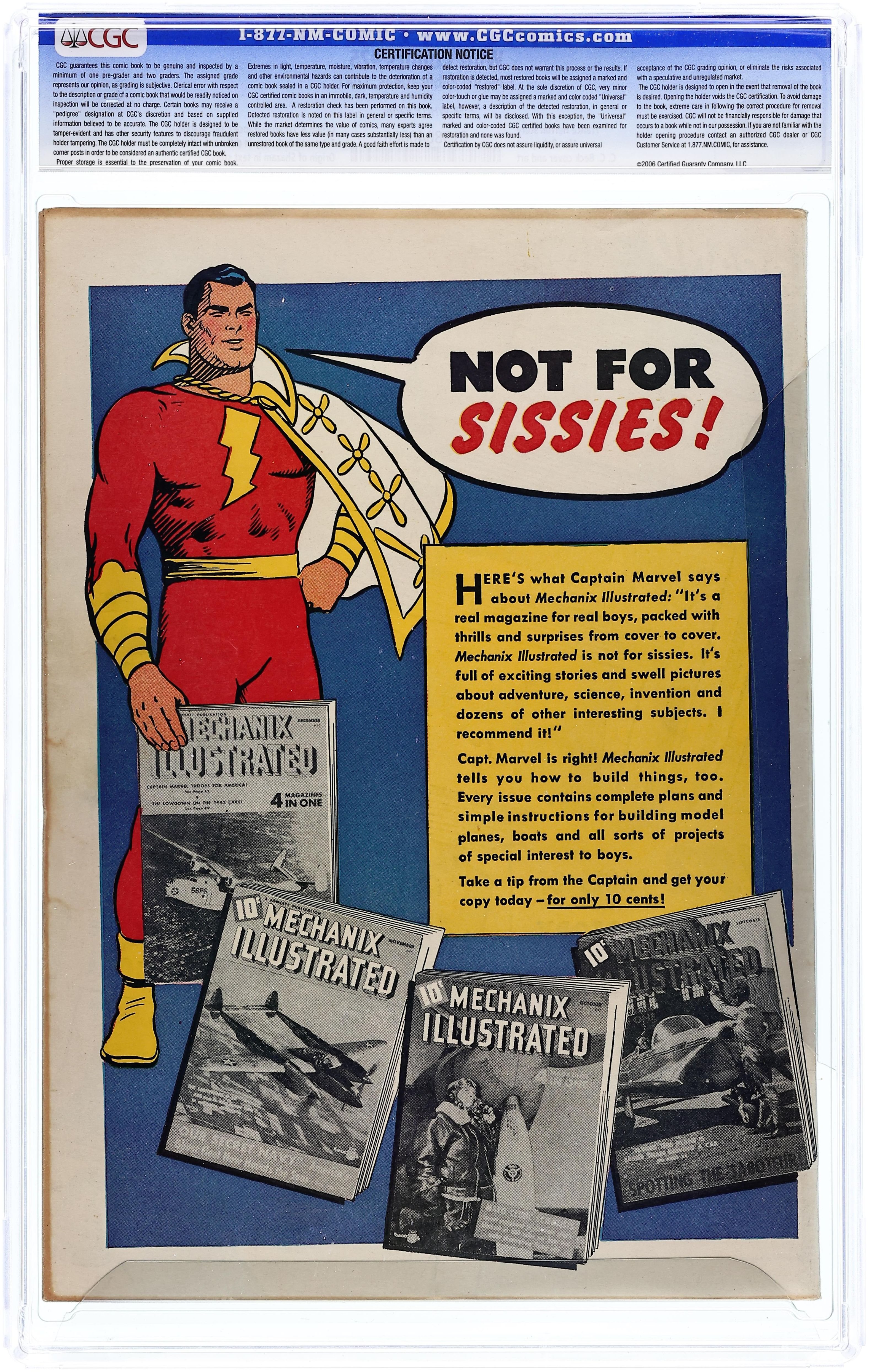 Cover pencils by C. C. Beck, inks by Pete Costanza. "The Origin of Captain Marvel, Jr.," script by France Herron, art by C. C. Beck; Mac Raboy; Captain Nazi cuts Station WHIZ off the air and Cap races for the radio sending station to deal with the issue and saves Whitey in the process; He then must stop a powerful turbine from spinning out of control and costing the lives of innocent people. "Strongest Man in the World" starring Golden Arrow. "The Origin of Shazam: 1: Solomon - Wisest of Men" text story, art by Juan Lopez. "America-Smasher's Ski Tank" starring Spy Smasher. "Red Bart's Evil Plot" starring Lance O'Casey. "The Death Guards Ride" starring Dr. Voodoo, art by Mark Schneider; Hal and Nero are rescued from the burning ship by Don Luis; Anita is taken from Svenson by the Death Guards. "The Evil That Men Do Lives After Them" starring Ibis the Invincible, art by the Binder studio. 68 Pages, Full Color. Cover price $0.10.