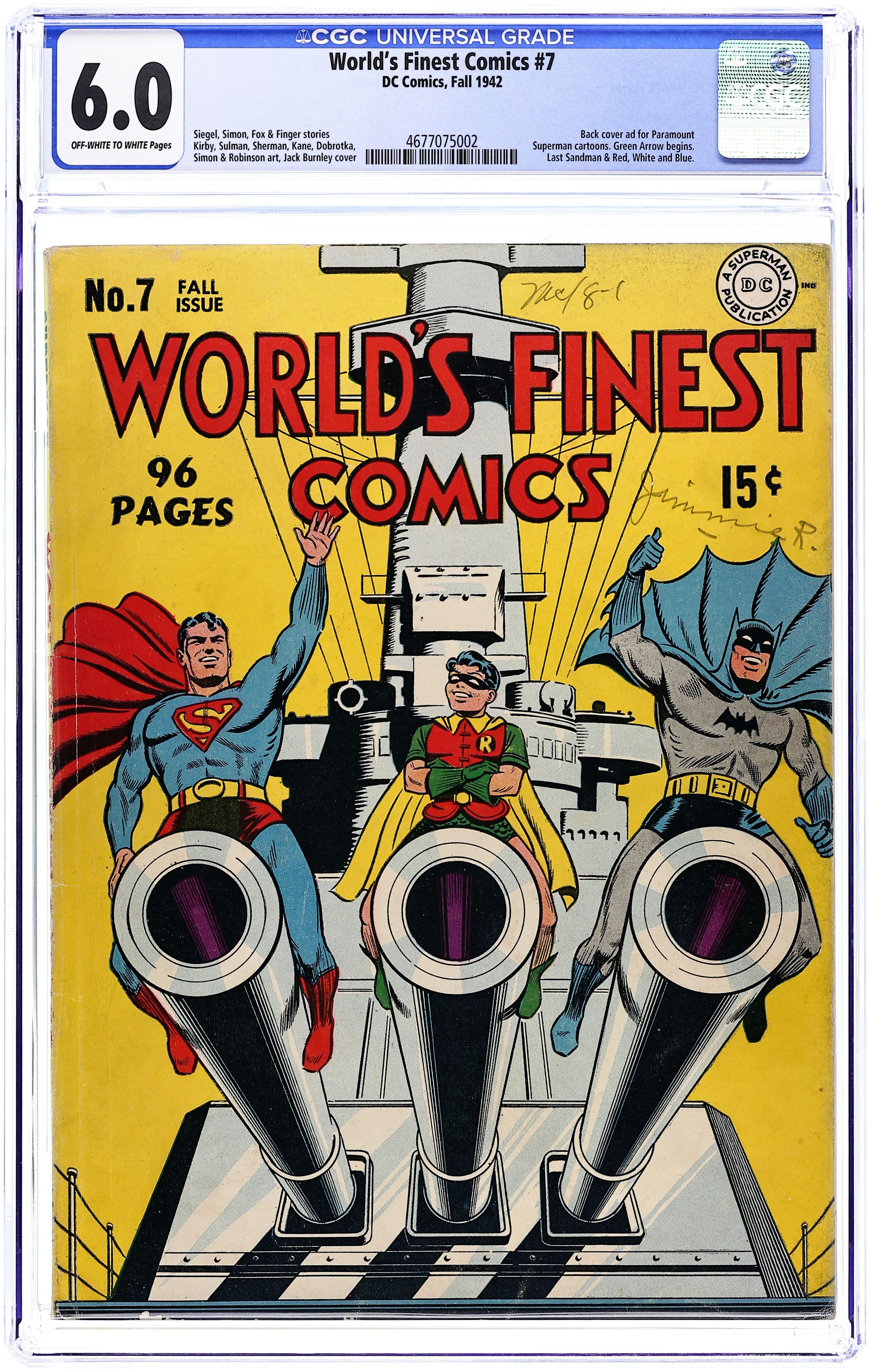 Cover art by Jack Burnley. The Eight Doomed Men! starring Superman, script by Jerry Siegel, pencils by Ed Dobrotka [as Joe Shuster], inks by John Sikela [as Joe Shuster]; The members of the Elkhart University Pi Theta Dau fraternity vow upon graduation to meet 20 years later, and that they do.......where someone vows to kill each and every one of them! Case of the Walking Dynamo, art by Joseph Sulman. Wise Lady, script by Edgar Weston, art by Fred Ray. A Modern Arabian Nightmare starring The Sandman and Sandy, script by Joe Simon, pencils by Jack Kirby, inks by Joe Simon. The Case of the Jinxed Skyscraper starring The Star Spangled Kid and Stripesy, script by Jerry Siegel, art by Hal Sherman. The Phantom Voice starring Red, White and Blue, art by Ken Battefield [as Kajeb]. Wings of Flame starring The Green Arrow, art by Bernard Klein. The Vanishing V-Men starring Lando, art by Harris Levy. The North Pole Crimes! starring Batman and Robin, script by Bill Finger, pencils by Bob Kane, inks by Jerry Robinson; A ruthless gang of criminals heads to the far north to commit crimes and the Dynamic Duo must solve the riddle of their leaving a snowman at the scene of every crime they commit. Advertisement for Paramount Picture's Superman cartoon series. 100 pages, Full Color. Cover price $0.15.