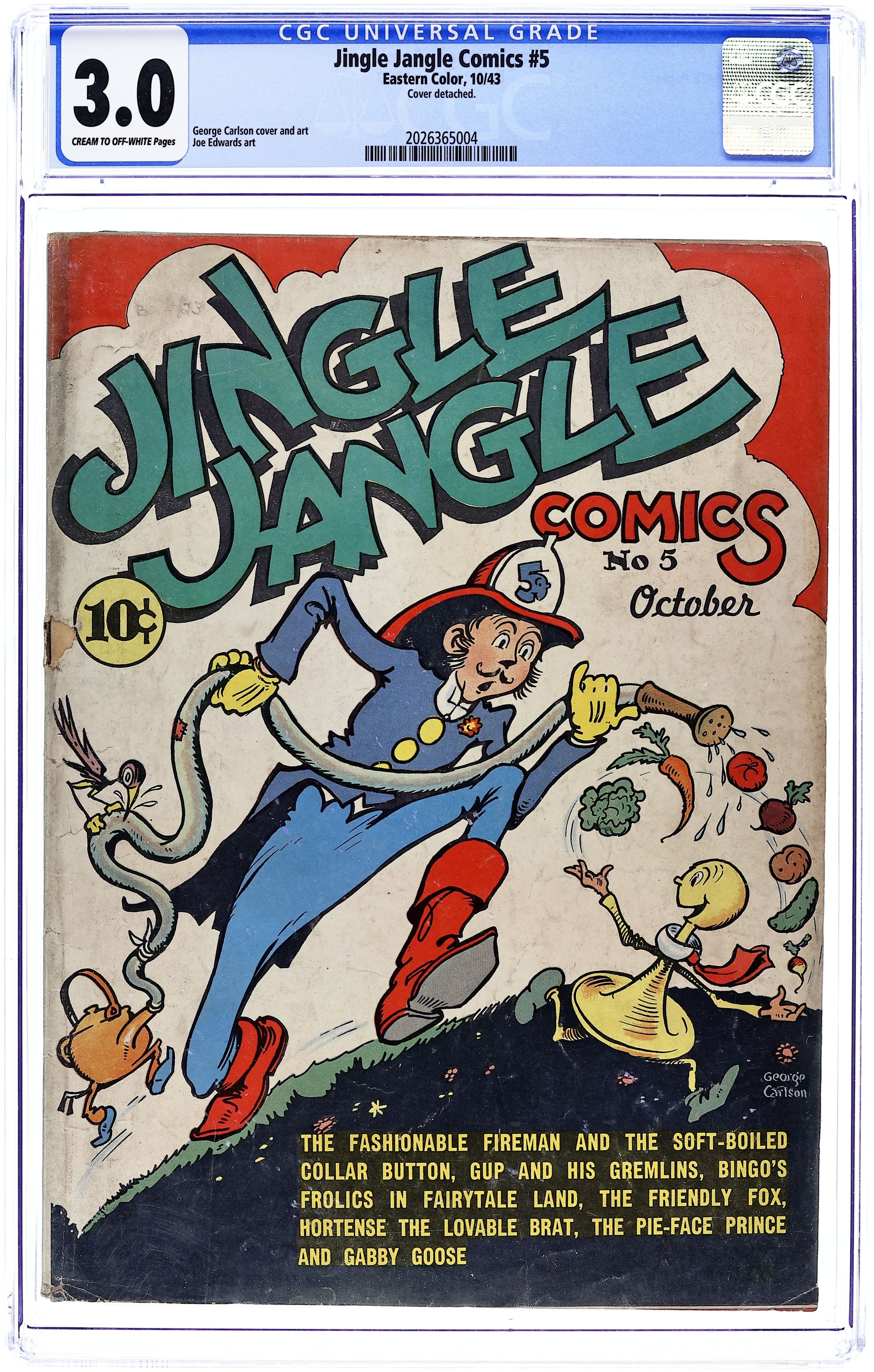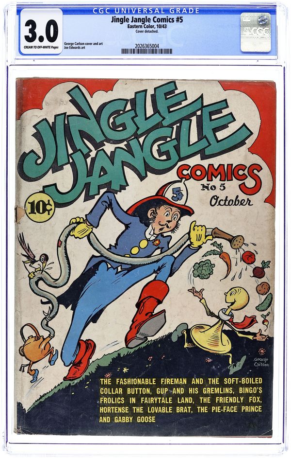 Cover by George Carlson. Stories and art by George Carlson and Wood Cowan. Kids' comics featuring the whimsical fables of beloved artist George Carlson, praised by Harlan Ellison as a "comic of the absurd." A smart Collar Button and a Blond Mazurka help the Fashionable Fireman find his lost Carnival Badge. The Pie-Faced Prince and Princess Panatella Murphy take off in a 10-Cent 18-Karat Balloon to seek a missing Bass Drum. Also featuring an ad for an "Aircraft Spotters' Handbook" that allows readers to tell enemy aircraft at a glance - a piece of WWII history. Jingle Jangle Tales: The Fashionable Fireman and the Soft-Boiled Collar Button; Gup and His Gremlins; The Friendly Fox; What Happened Next; Bingo's Frolics in Fairytale Land; The Pie-Faced Prince of Pretzleburg; Gabby Goose; Hortense the Lovable Brat. 56 pages, Full Color. Cover price $0.10.