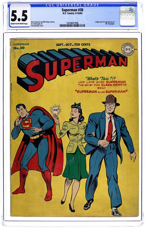 Origin and first appearance of Mr. Mxyztplk (later Mxyzptlk). Superman flies for the first time. Cover art by Jack Burnley. Superman Alias Superman, script by Don Cameron [as Jerry Siegel], pencils by Ira Yarbrough [as Joe Shuster]; Lois Lane thinks Clark Kent is trying to trick her into believing he's Superman! Untitled Lois Lane story, script by Don Cameron [as Jerry Siegel], pencils by Ed Dobrotka [as Joe Shuster]; Lois is taken prisoner by the Dover gang. The King's Substitute!, script by Bill Finger [as Jerry Siegel], art by Ira Yarbrough [as Joe Shuster]; Unhappy because his father-in-law to be considers him to be a nobody, Johnny Poly goes to Poltavia to bid on a picture of the nation's ancient monarch. Death of a Pirate text story by Eric Carter. The Mysterious Mr. Mxyztplk!, script by Jerry Siegel (signed), pencils by Joe Shuster (?) and Ira Yarbrough [as Joe Shuster]. Handy Andy humor page by Jack Farr. 52 Pages, Full Color. Cover price $0.10.