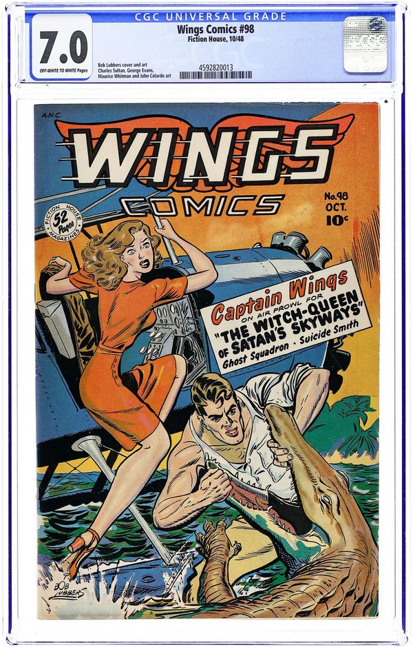 Cover by Bob Lubbers. Edited by J.F. Byrne and William R. Shelton. Stories and art by Bob Lubbers, Art Saaf, Charles Sultan, George Evans, John Celardo and Maurice Whitman. Aviation-themed adventure, combat and history tales from pioneering comics publisher Fiction House. Reporter Jane Martin seeks a vanished European politician in the snowy mountains; Suicide Smith tries to calm enraged South American natives after dam workers steal an idol; A mysterious bird-spirit seems to drive a shell-shocked veteran to murder. Captain Wings; Jane Martin; The Flying Furies; Air Heroes of World War II; Phantom Falcon; Suicide Smith; Ghost Squadron. 52 pages, Full Color. Cover price $0.10.