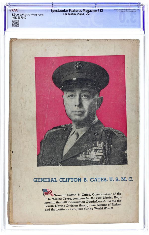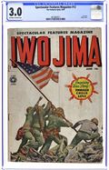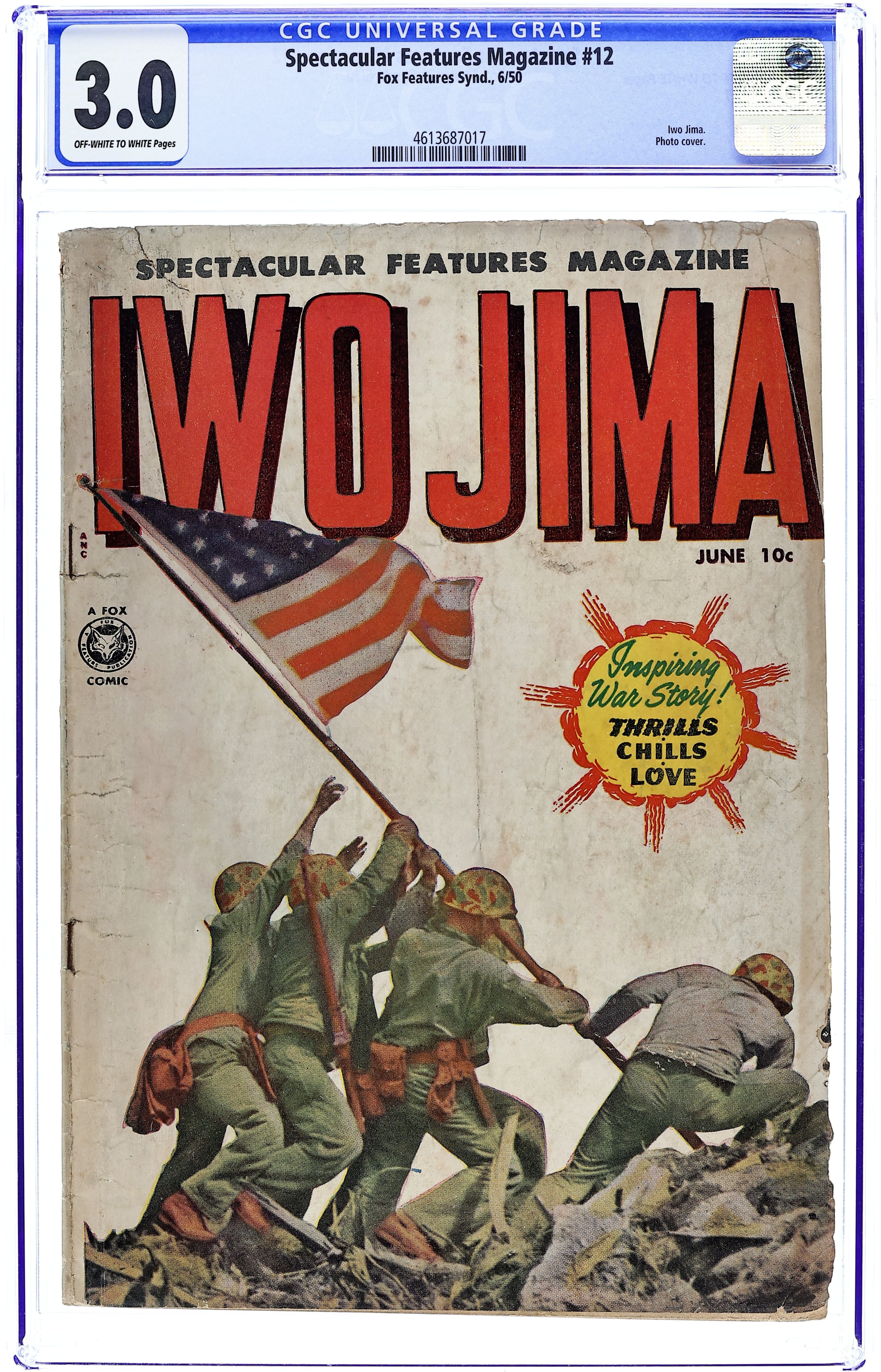 Cover by Joe Rosenthal. The Battle of Iwo Jima in comics form from Fox Feature. Numbering continues from Spectacular Feature Magazine Samson and Delilah (1950) #11. The story of the crucial mission that changed the course of the War in the Pacific, as well as inspiring one of the most memorable images in 20th century history. Also featuring a biography of Robert Louis Stevenson, author of Treasure Island and Dr. Jekyll and Mr. Hyde. Cover is a reproduction of the iconic Iwo Jima photo by Joe Rosenthal. Iwo Jima; Robert Louis Stevenson; Knucklehead. Followed by Spectacular Features Magazine (1950) #3. 32 pages, Full Color. Cover price $0.10.