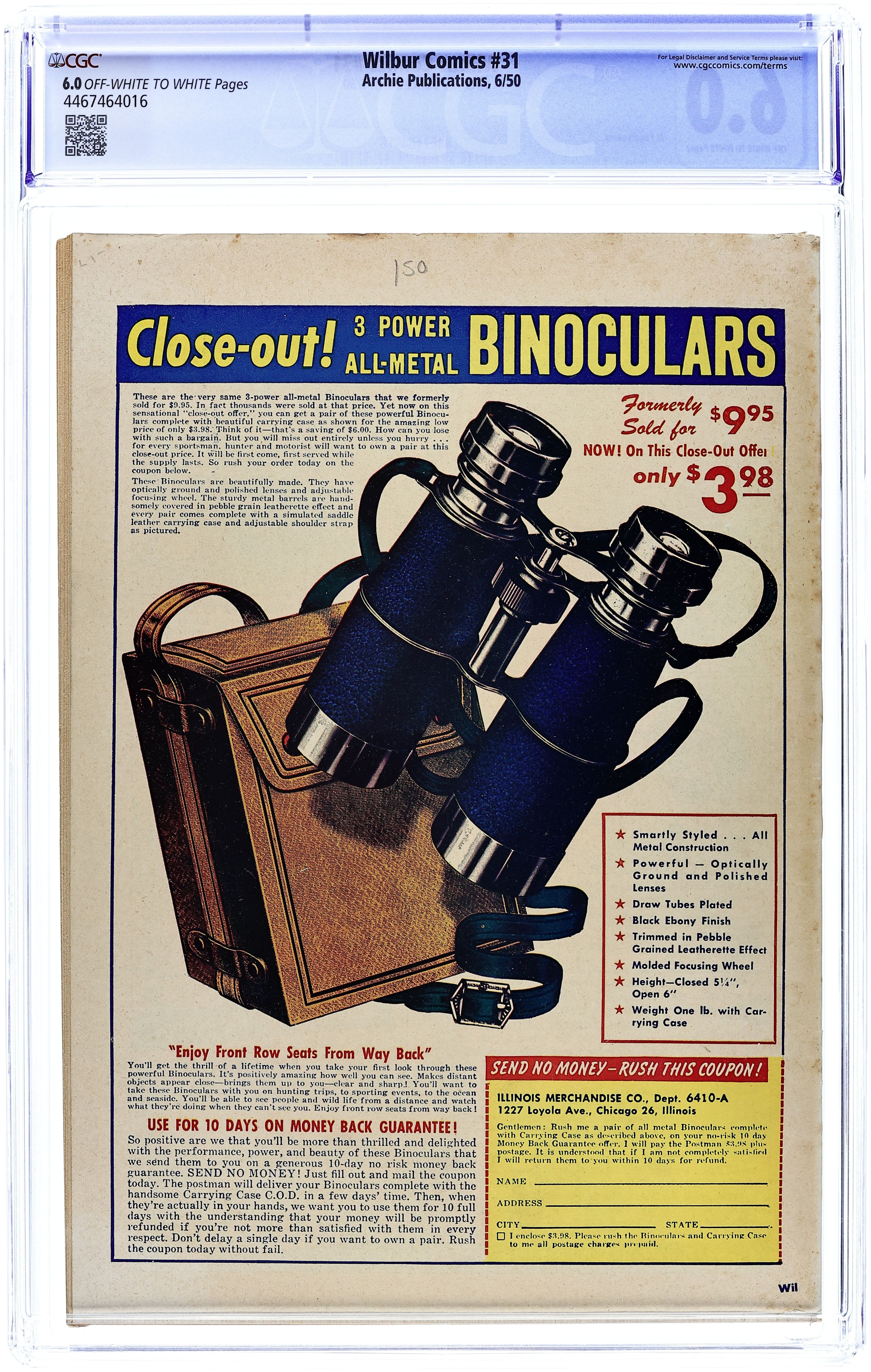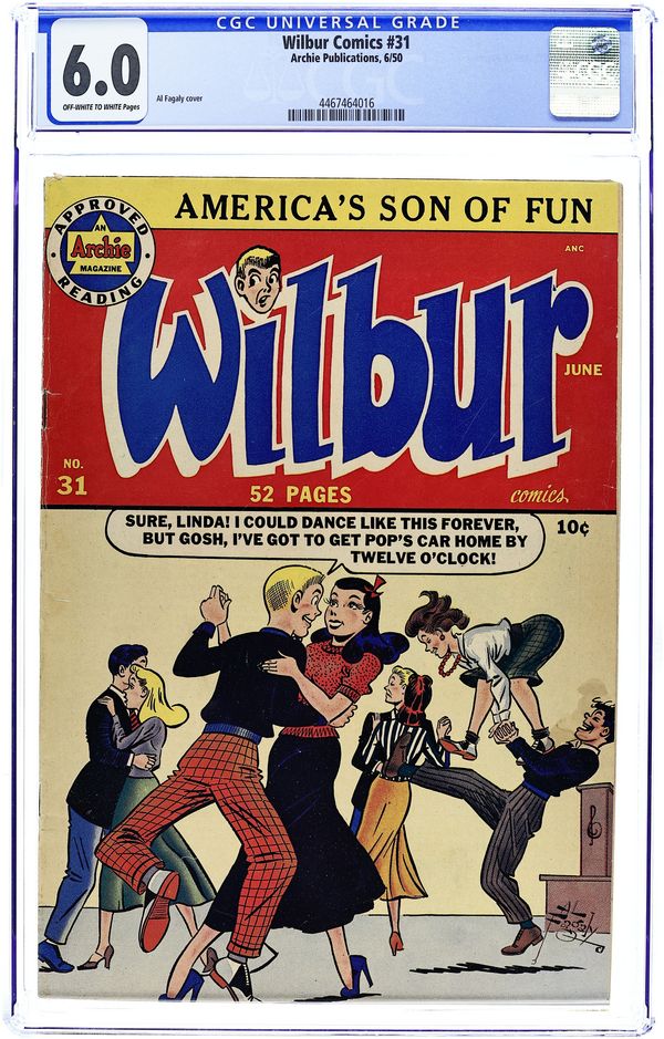 Cover art by Al Fagaly. "Finders Weepers"; Wilbur finds a wallet with a fifty dollar bill in it. "It Pays to Advertise!"; Wilbur gets a job at the Drink Rink as a soda jerk. "The Water Works"; Slats goes fishing when Wilbur is put in charge of the class while Miss Gargle goes to a meeting. Archie house ad. "The Builder"; Wilbur and Red build a garage for Wilbur's car. Betty and Veronica house ad. Stuff About Stars article. Archie house ad. Untitled Katy Keene story, script and art by Bill Woggon; K. O. asks Katy to go skiing, but then Randy asks her to go swimming with him. Katy Keene and Archie Series house ads. "Love Notes"; Wilbur goes to Laurie's to hear some new records. 52 pgs., full color. Cover price $0.10.