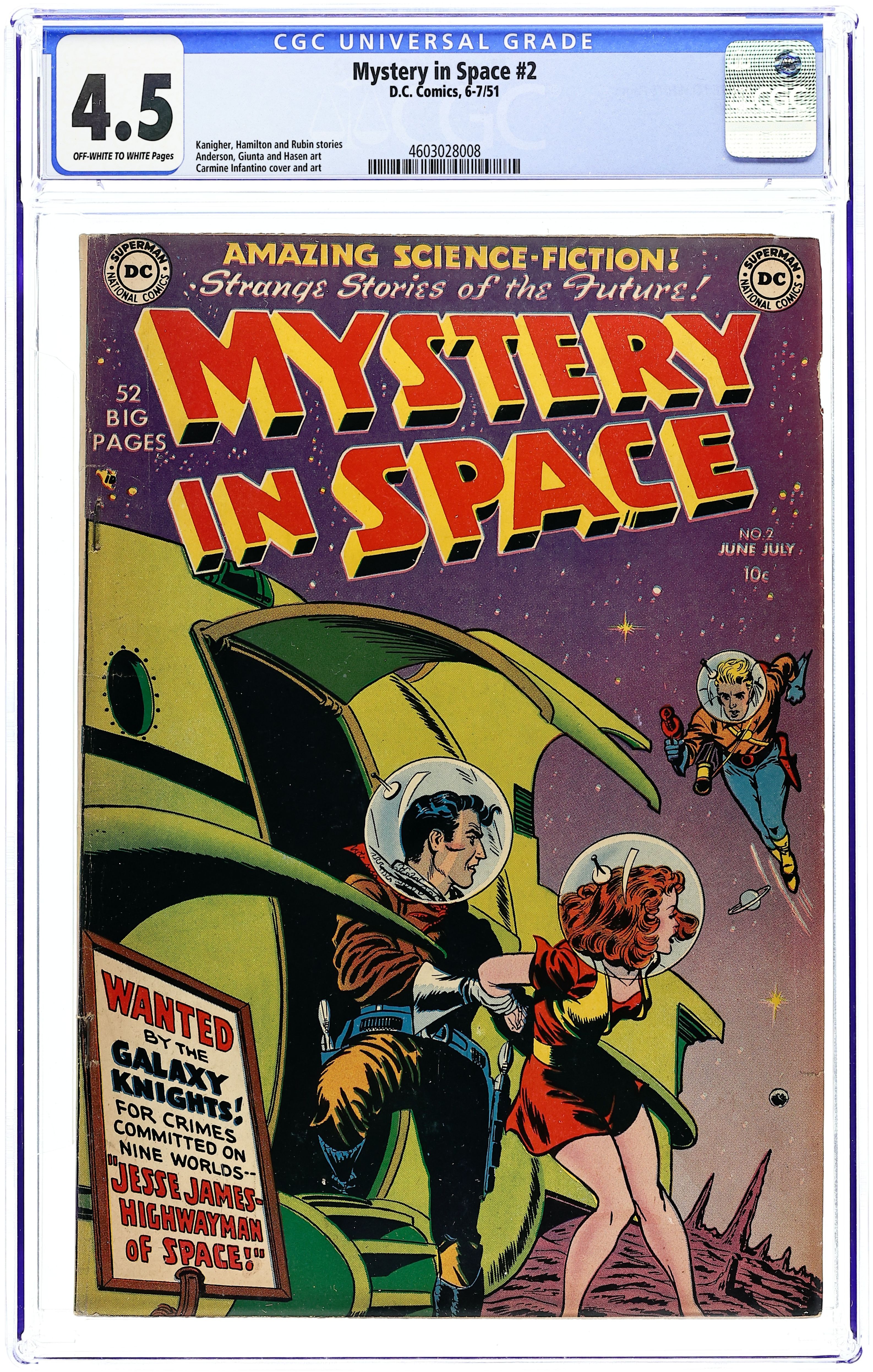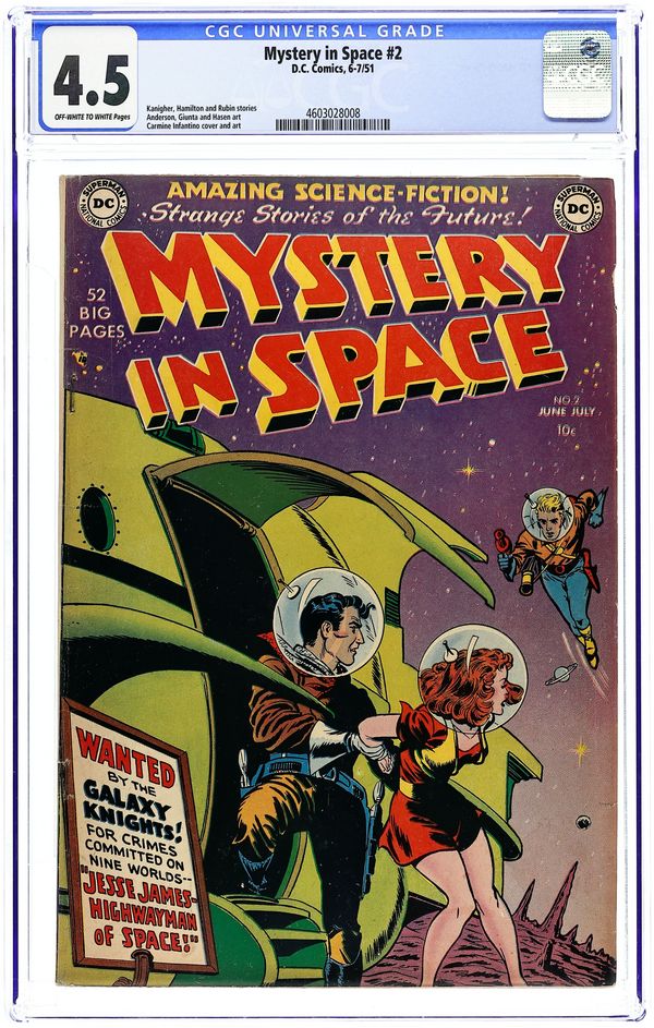 Knights of the Galaxy in "Jesse James--Highwayman of Space" (script by Robert Kanigher as "Dion Anthony," pencils by Carmine Infantino?), "Secret of the Ages" (script by "Hugh Davidson"), "The Comet Peril" (script by Edmond Hamilton), and "The Micro-Men!" (script by John Broome as "Robert Starr"). Murphy Anderson art. One-page Tootsie Roll ad "Captain Tootsie To the Rescue" by Bill Schreiber. 52 Pages, Full Color. Cover price $0.10.
