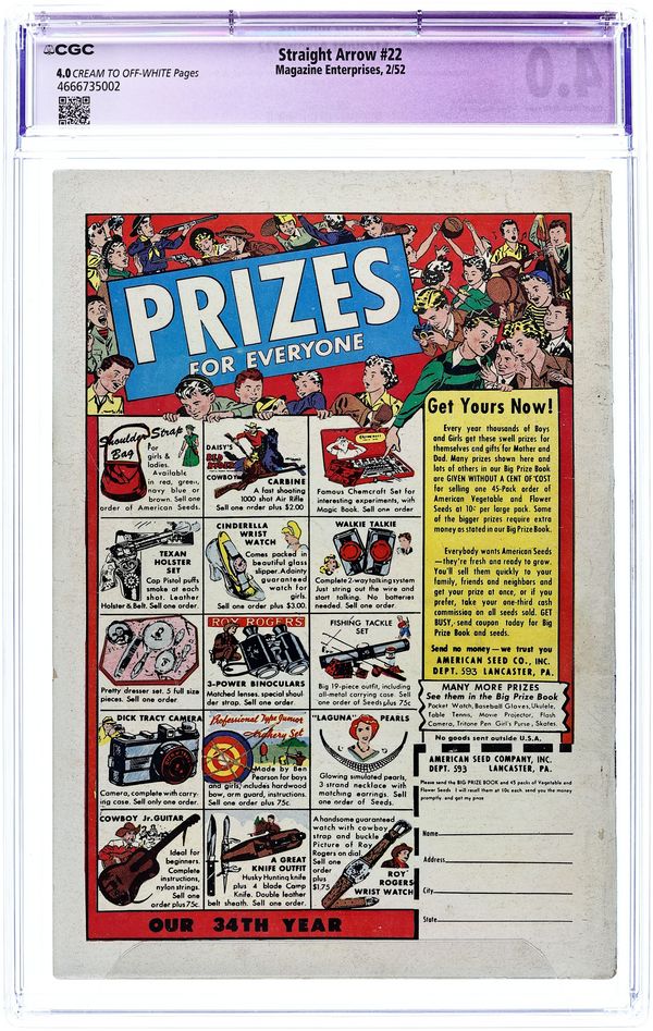 Published Feb 1952 by Magazine Enterprises.Straight Arrow (1950 Magazine Enterprises) 22 CGC 4.0 Restored