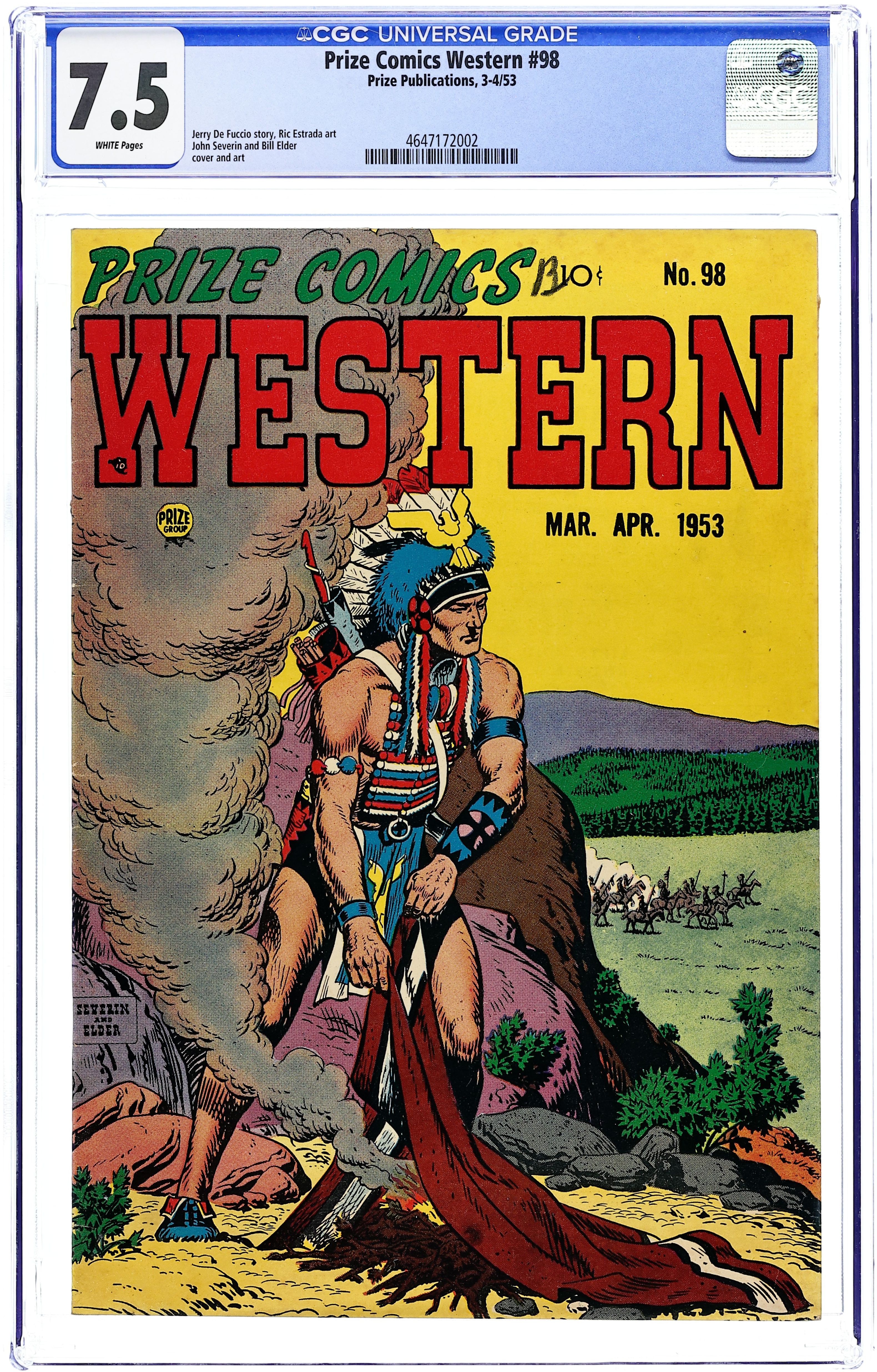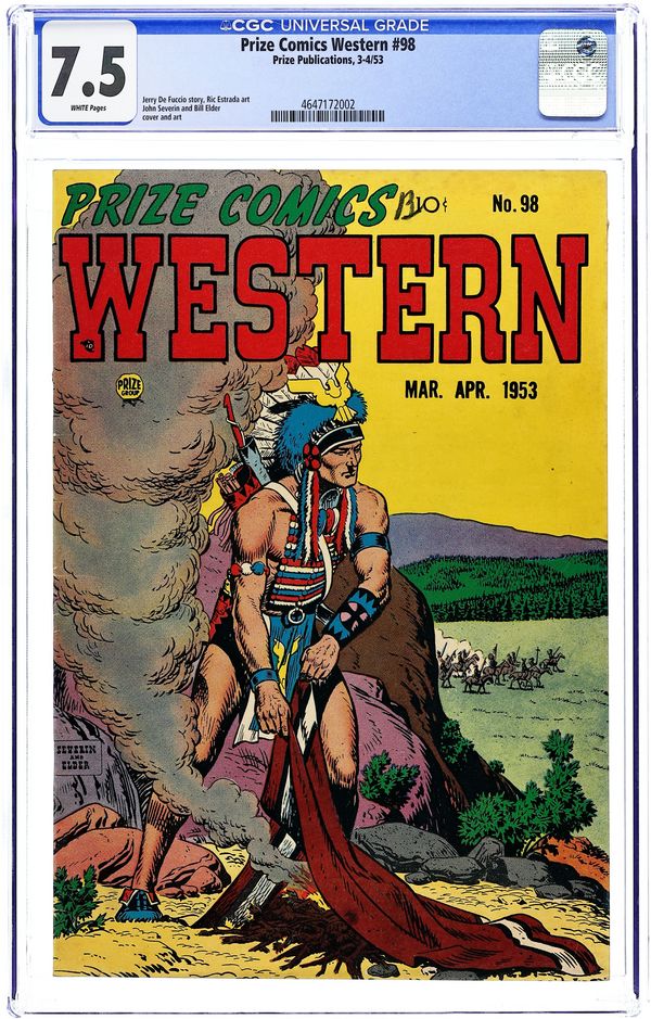 Cover by Will Elder and John Severin. Stories and art by Jerry De Fuccio, Ric Estrada, Will Elder and John Severin. Prize's flagship Western title featured early art by John Severin and other greats who worked for EC in the following decade. American Eagle returns to Canada to help a friend battle Louis Riel's rebellion. Three stories and a cover featuring early art by EC legends Jerry De Fuccio, Will Elder and John Severin. Confederate deserters plot to steal enough gold from the Black Hills to finance a second War Between the States. Rebellion; Sitting Bull; The Roundup; Army Beef; Zebulon Pike; Deserter. 32 pages, Full Color. Cover price $0.10.
