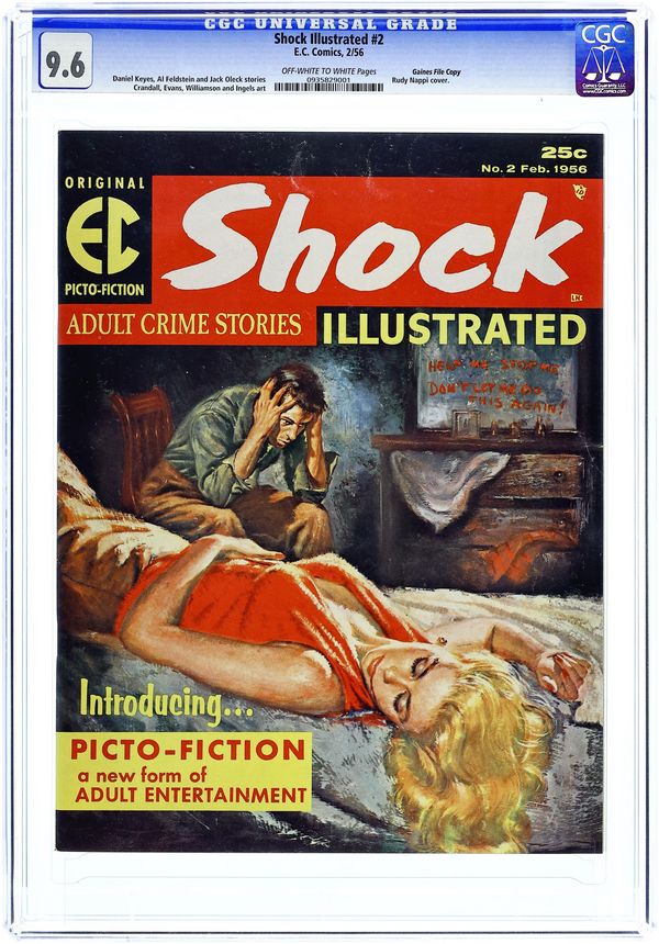 Painted cover by Rudy Nappi. Stories by Daniel Keyes, Jack Oleck, and Al Feldstein. Art by Reed Crandall, George Evans, Al Williamson, and Graham Ingels. Part of EC's Picto-Fiction line, published in response to the Comics Code, featuring crime tales in text stories copiously illustrated by EC's lineup of artists. Cops capture "The Lipstick Killer" after a murder spree, and psychoanalysis reveals his accidental first murder when he was a toddler. A macabre bet between two med-school students leads to a man being buried alive, but the truth is worse still. A sheriff seeks the truth about a woman's death. Featuring some stories by Daniel Keyes, later the author of the science fiction classic Flowers for Algernon. The Lipstick Killer; My Brothers Keeper; A Question of Time; Dead Right. 8 1/2-in. x 11-in., 60 pages, B&W with single-color accents. Cover price $0.25.
