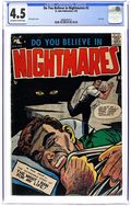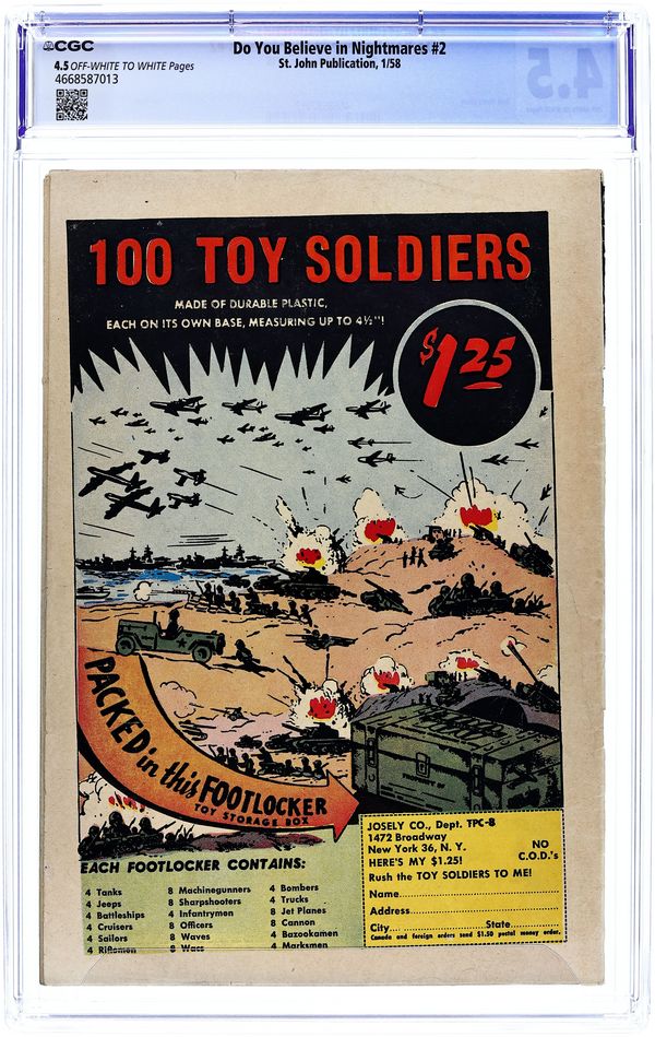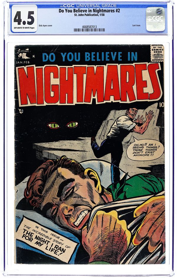 Cover by Dick Ayers. Stories and art by Dick Ayers and others. A short-lived attempt at horror under the new Comics Code from St. John. All of the stories in this issue feature early art from comics legend Dick Ayers. Scientist George perfects a super-growth formula, but then things go horribly wrong, as they so often do in these stories. When little Timmy reveals that he can move objects with his mind, the adults around him see dollar signs. A safecracker on the job can't shake the feeling that he's not alone. The Night I Ran for My Life!; A Fabulous Firm!; Conscience; Mission on the Hill; You Are Not Alone; I Have 3 Questions; Why Won't Anybody Believe Me? Final issue of the series. 32 pages, Full Color. Cover price $0.10.
