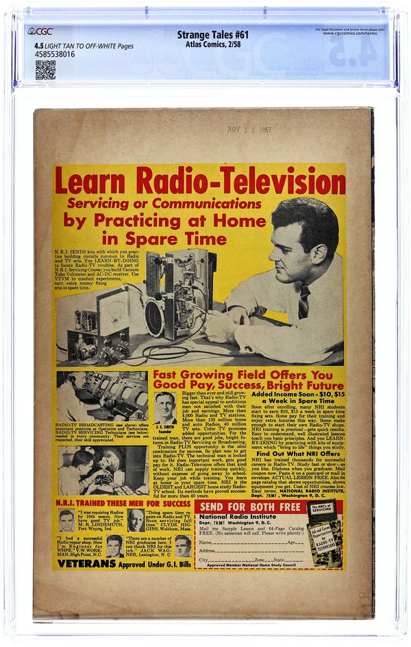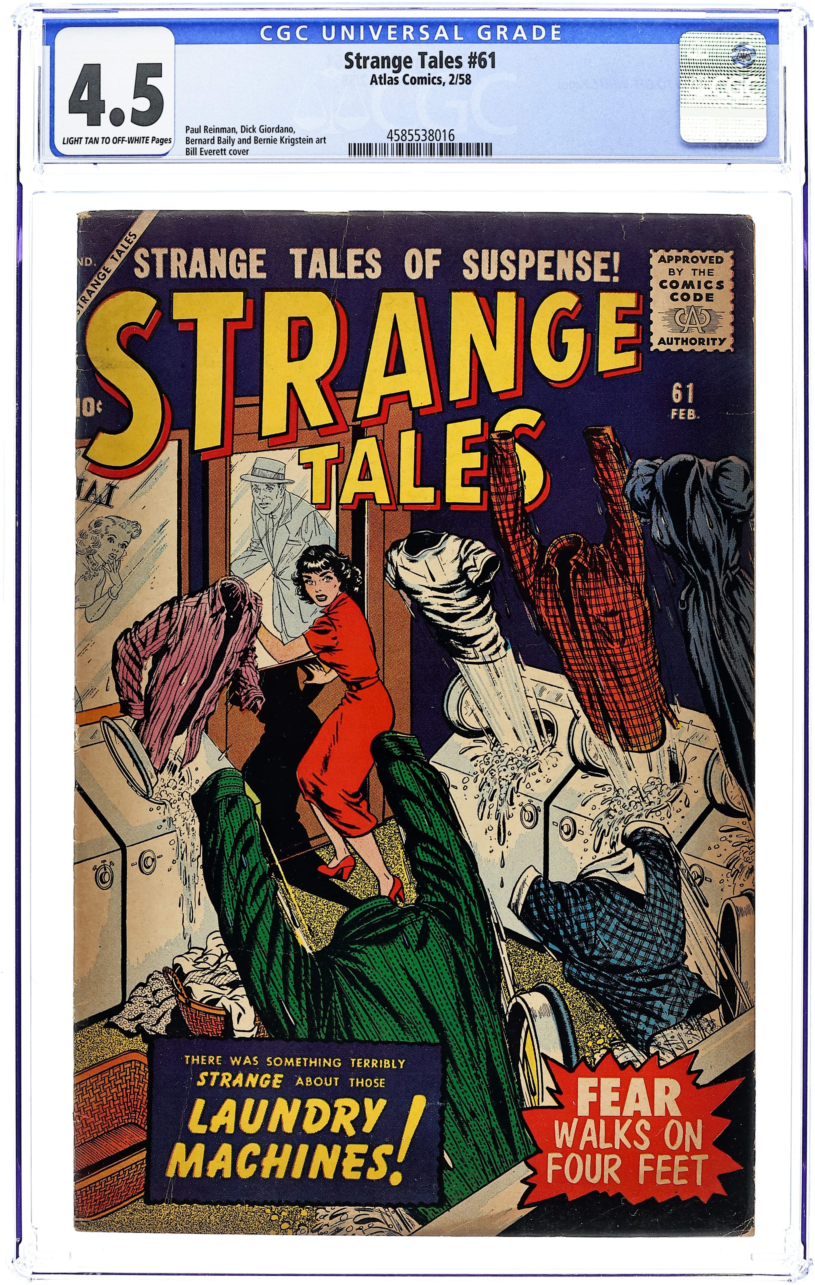 Cover art by Bill Everett. "The Laundry Machines!", art by Paul Reinman; A landlord squeezes a Haitian laundress for more rent and is made ill by voodoo; He has her deported, but the box holding the pills to cure him contains only more boxes, one within the next. "The Spectre," art by Dick Giordano; A race car driver refuses to drive after he sees a ghost; His manager thinks it is a hallucination, and pays a mystic to convince him it is safe. "The Miracle Painting" text story, art by Doug Wildey. "The Disappearing Man!", art by Ed Winiarski; A scientist who disappeared years ago returns, explaining that he is now king of an alternate dimension His greedy friend hopes to take over the dimension for himself, but ends up imprisoned indefinitely. "Menace of the Mirror," art by Bernard Baily; A scientist thinks he has invented a machine to give life to reflections in a mirror, but when he tests it he realizes that he himself is a reflection. "Fear Walks on Four Feet!", art by Al Eadeh; A man tries to ruin his partner and romantic rival; He overpowers a ray intended to capture a lion and it explodes; He seems to be blown into the past and hides for a year. "The Eyes That Never Close!", art by Bernie Krigstein; A prisoner tries to escape using a mystic idol, but it will only take the evil on doomed journeys through time, and he is trapped in Hiroshima just before the bomb falls. 36 pgs., full color. Cover price $0.10.