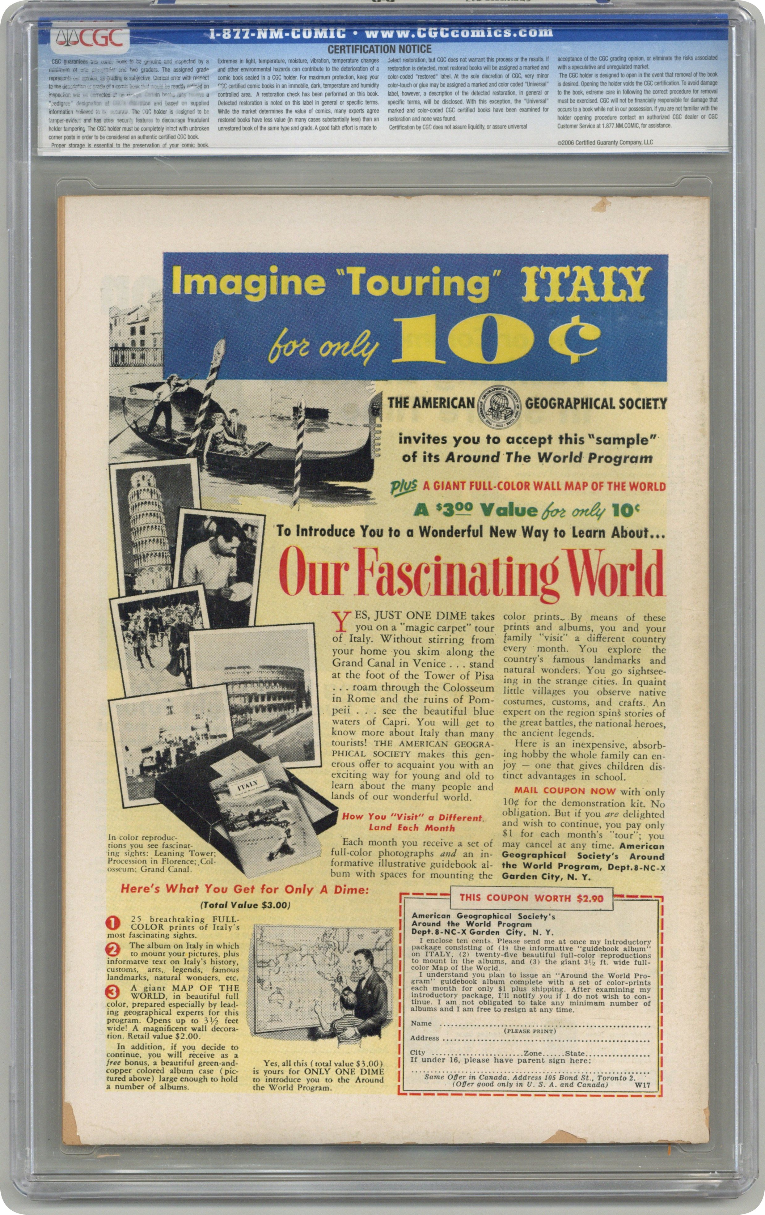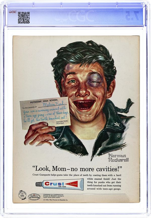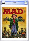 Cover art by Kelly Freas. Parody of American Express Travelers Cheques ads, , art by Kelly Freas. "MAD's M.V.B.T.A. Awards," script by Larry Siegel, art by George Woodbridge; Acting awards for baseball players hamming it up for fans and the camera during games. "The End of Comics," script by Tom Koch, art by Wally Wood; Possible final strips for when newspapers have to eliminate comics to use the space for more educational features. "Scenes We'd Like To See: The Frogmen," art by Joe Orlando. "The Electricians," script and art by Don Martin; Two building maintenance men try to find why a toaster won't work. "If Hollywood Directors Staged...Advertising Photos," art by Wally Wood; Parodies of ads depicted in the styles of directors: Alfred Hitchcock; Elia Kazan; Cecil B. DeMille; Sam Katzman. "Pushcarts," script and art by Dave Berg; History of merchandising by pushcarts and projection to a future where stores are so large that vendors sell by pushcarts within the stores. "The MAD Halloween Trick-Or-Treatment," script by Frank Jacobs, art by Mort Drucker; A list of revenges against common Halloween pranks. "The MAD Treasury of Unknown Poetry," script by Tom Koch, art by Joe Orlando. "The New Baby," script by Milton Schafer and Danny Kaye, art by Wally Wood; Song lyrics as performed by Danny Kaye, with illustrations. "Music Report," script by Bob Elliott and Ray Goulding, art by Mort Drucker; Wally interviews a man who tests the truth of song lyrics and watches him demonstrate "It's a treat to beat your feet in the Mississippi Mud." "Woodlore," art by George Woodbridge; A guidebook to (phony) dangerous plants and animals of the woods. Parody of ad for Crest Toothpaste, with painting signed as "Norman Rocknroll," art by Kelly Freas. 52 pgs., B&W.
