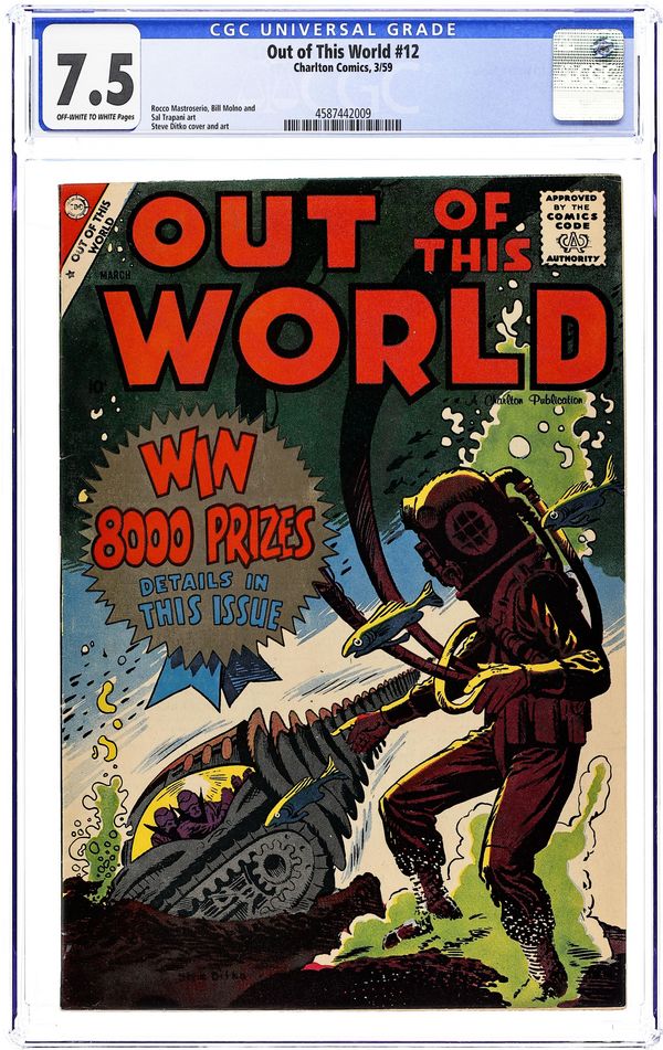 Cover by Steve Ditko. Stories and art by Steve Ditko, Rocke Mastroserio, Sal Trapani, and Bill Molno. Charlton responds to the new Comics Code with kid-friendly tales of science fiction, often illustrated by Steve Ditko or other future comics legends. A scientist learns that a colony of ants has become smart - very smart, in one of two stories in his issue with art by Spider-Man co-creator Steve Ditko. In another Ditko story, an African explorer brings home a doll he stole from a native tribe, but the doll has a deadly secret. Hugo the robot is proud to keep house for Professor Tompkins, but the prof's sister just isn't satisfied with the furniture. The World Awaits; The Perfect Servant; A Living Doll; Escape; Playroom! 32 pages, Full Color. Cover price $0.10.