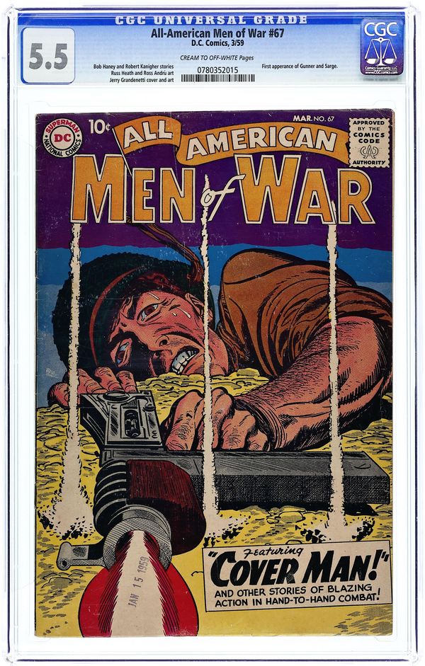 Edited by Whitney Ellsworth and Robert Kanigher. Cover by Jerry Grandenetti. 1st app. of Gunner & Sarge. Stories by Bob Haney, Jerry Grandenetti, Bob Haney, Russ Heath, Morris Waldinger, Tom Nicolisi, Robert Kanigher, Ross Andru, and Mike Esposito. Adventure tales of war and the military, including some humor—go into combat with All American Men of War! 36 Pages, Full Color. Cover price $0.10.