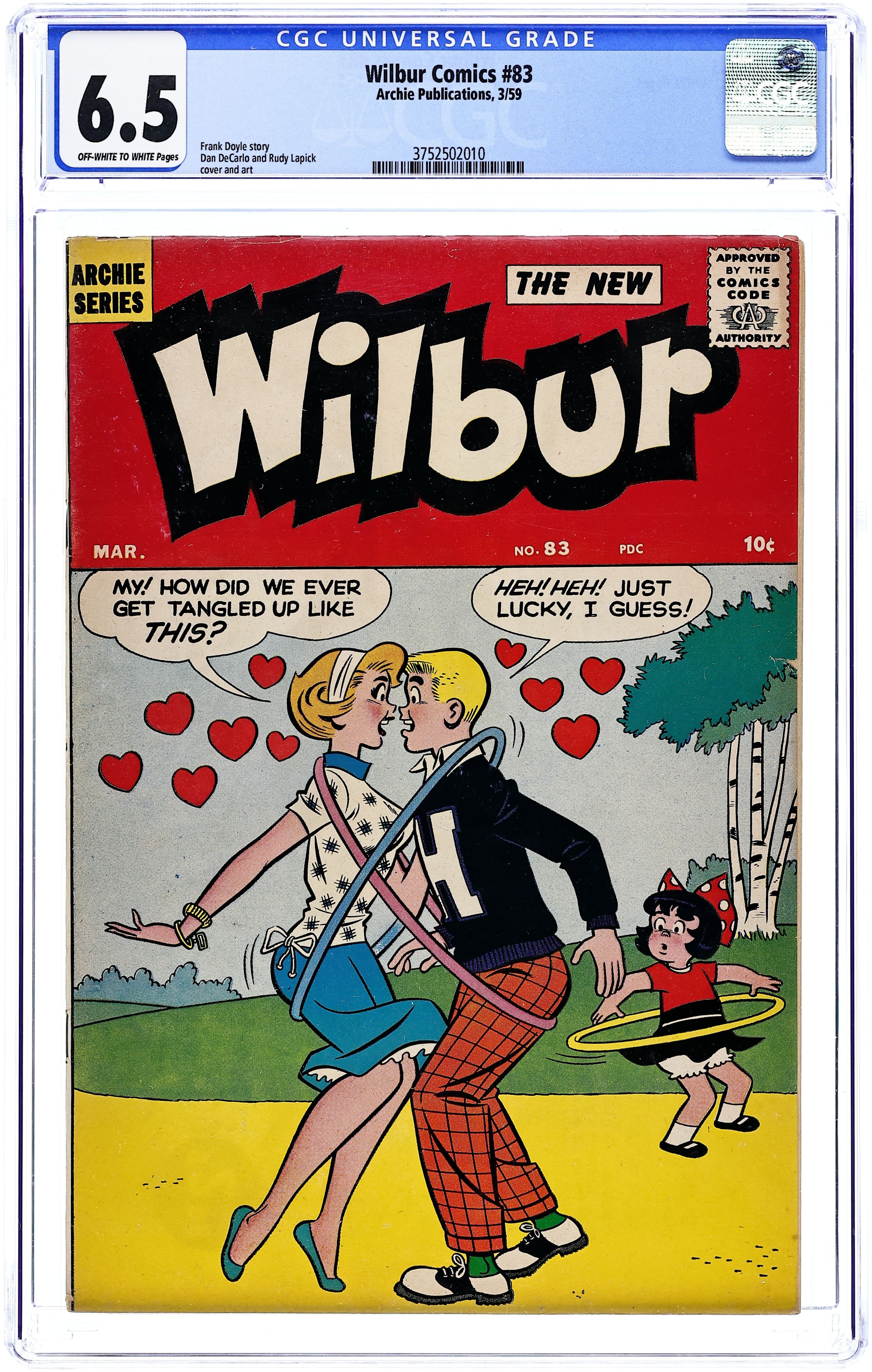 Cover pencils by Dan DeCarlo, inks by Rudy Lapick. "Going, Going, Gone," script by Frank Doyle, pencils by Dan DeCarlo, inks by Rudy Lapick; Laurie announces that she's leaving Westfield High and going to Miss Pringle's School For Young Ladies. "In and Out!" starring Li'l Jinx, script and art by Joe Edwards. "Finishing School," script by Frank Doyle, pencils by Dan DeCarlo, inks by Rudy Lapick; Laurie is away at Miss Pringle's Finishing School and everyone is starting to miss her. "Cool Pools," pencils by Dan DeCarlo, inks by Rudy Lapick; Wilbur and Sheldon discuss the personalized swimming pools that Hollywood stars would own (including Pat Boone, Elvis Presley, Jimmy Durante, Zsa Zsa Gabor and Lawrence Welk). "Dry Run," script by Frank Doyle, pencils by Dan DeCarlo, inks by Rudy Lapick; Linda is ecstatic when Wilbur wants to walk with her in the rain under an umbrella, until he walks them to Laurie's house. 36 pgs., full color. $0.10. Cover price $0.10.